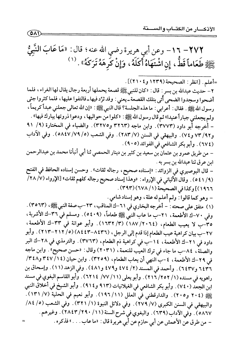 ٢٧٢ - ١٦ - وعن أبي هريرة رضي الله عنه؛ قال: «مَا عَابَ النَّبِيُّ صلى الله عليه وسلم طَعَامًا قَطُّ، إِنِ اشْتَهَاهُ أَكَلَهُ، وَإِنْ كَرِهَهُ تَرَكَهُ» (¬١) .