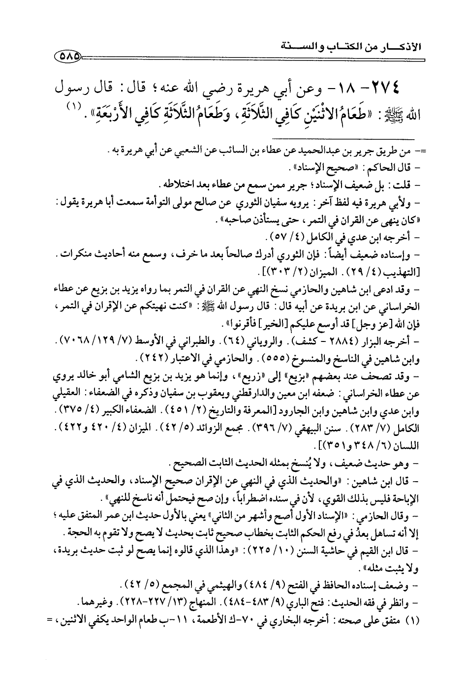 ٢٧٤ - ١٨ - وعن أبي هريرة رضي الله عنه؛ قال: قال رسول الله صلى الله عليه وسلم: «طَعَامُ الاثْنَيْنِ كَافِي الثَّلَاثَةِ، وَطَعَامُ الثَّلَاثَةِ كَافِي الأَرْبَعَةِ» (¬١) .