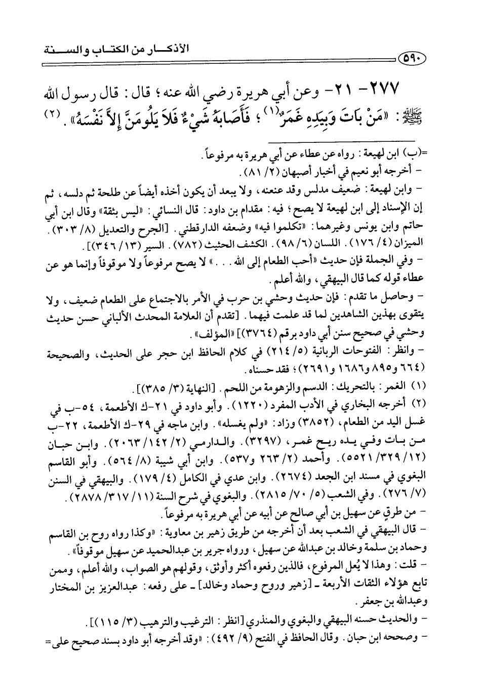 ٢٧٧ - ٢١ - وعن أبي هريرة رضي الله عنه؛ قال: قال رسول الله صلى الله عليه وسلم: «مَنْ بَاتَ وَبِيَدِهِ غَمَرٌ (¬١) ؛ فَأَصَابَهُ شَيْءٌ فَلَا يَلُومَنَّ إِلَاّ نَفْسَهُ» (¬٢) .
