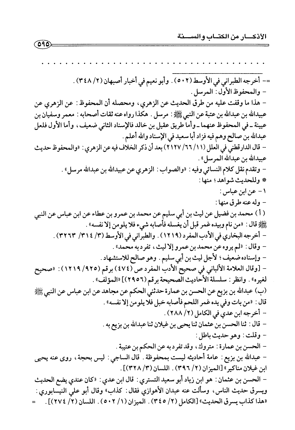 - قال الدارقطني في العلل (١١/ ٦٦/ ٢١٢٧) بعد أن ذكر الخلاف فيه عن الزهري: «والمحفوظ حديث عبيد الله بن عبد الله المرسل».