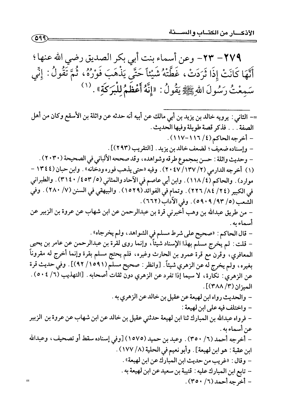 ٢٧٩ - ٢٣ - وعن أسماء بنت أبي بكر الصديق رضي الله عنها؛ أَنَّهَا كَانَتْ إِذَا ثَرَدَتْ، غَطَّتْهُ شَيْئًا حَتَّى يَذْهَبَ فَوْرُهُ، ثُمَّ تَقُولُ: إِنِّي سَمِعْتُ رَسُول اللهِ صلى الله عليه وسلم يَقُولُ: «إِنَّهُ أَعْظَمُ لِلْبَرَكَةِ» (¬١).