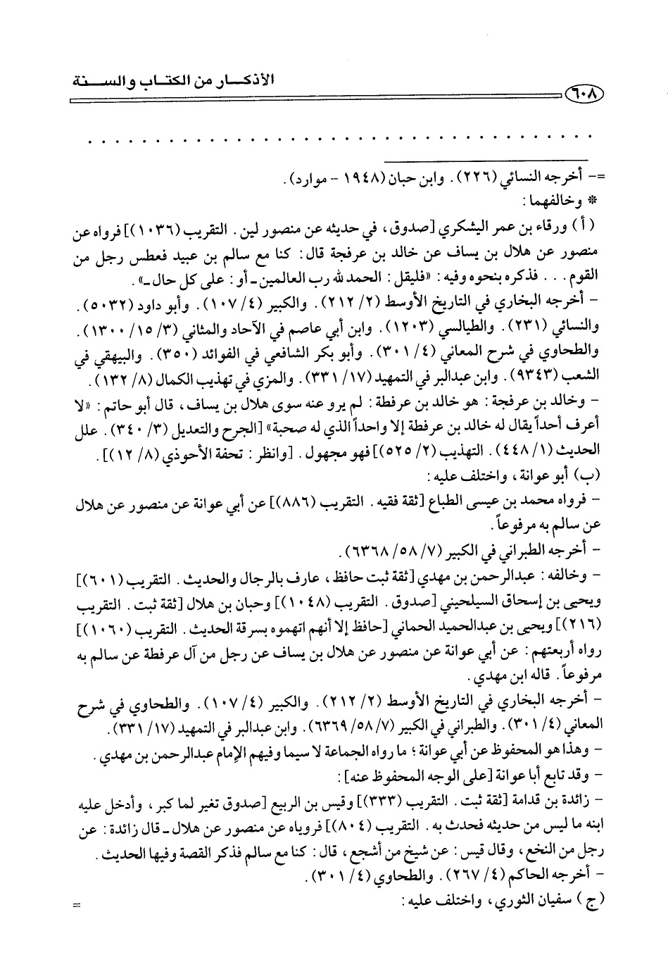 - ويحيى بن إسحاق السيلحيني [صدوق. التقريب (١٠٤٨)] وحبان بن هلال [ثقة ثبت. التقريب (٢١٦)] ويحيى بن عبد الحميد الحماني [حافظ إلا أنهم أتهموه بسرقة الحديث. التقريب (١٠٦)] رواه أربعتهم: عن أبي عوانة عن منصور عن هلال بن يساف عن رجل من آل عرفطة عن سالم به مرفوعا. قاله ابن مهدي.