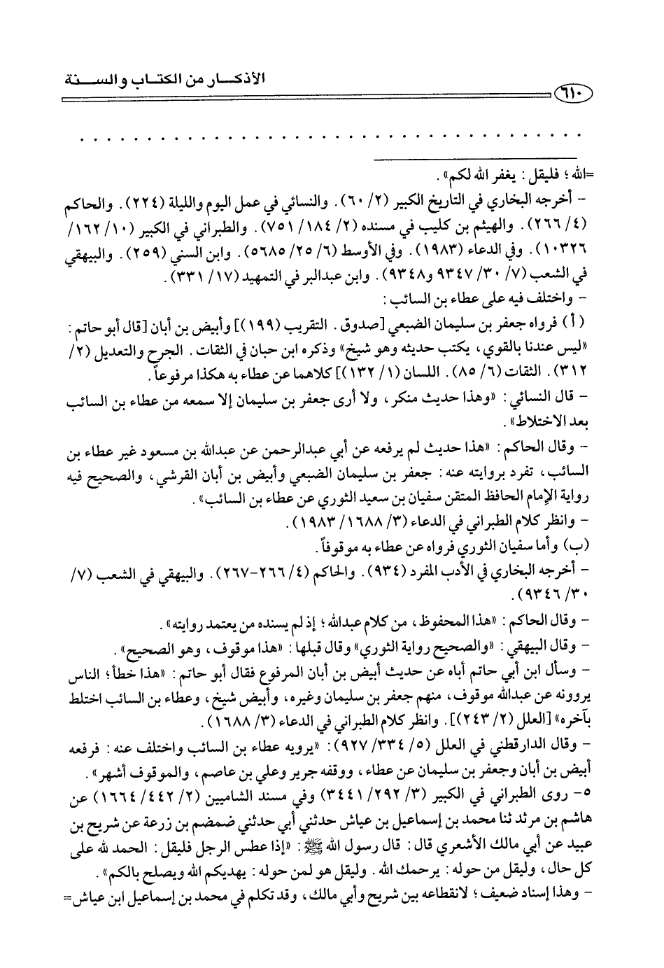 ٥ - روي الطبراني في الكبير (٣/ ٢٩٢/ ٣٤٤١) وفي مسند الشاميين (٢/ ٤٤٢/ ١٦٦٤) عن هاشم بن مرثد محمد بن أسماعيل بن عياش حدثني أبي حدثني ضمضم بن زرعة عن شريح ابن عبيد عن أبي مالك الأشعري قال: قال رسول الله صلي الله عليه وسلم: «إذا عطس الرجل فليقل: الحمد لله على كل حال، وليقل من حوله: يرحمك الله. وليقل هو لمن حوله: يهديكم الله ويصلح بالكم».