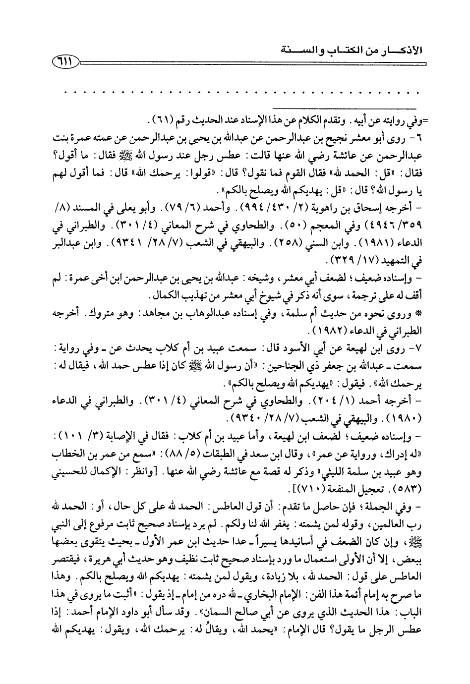 ٦ - روي أبو معشر نجيح بن عبد الرحمن عن عبد الله بن يحي بن عبد الرحمن عن عمته عمرة بنت عبدا لرحمن عن عائشة رضي الله عنها قالت: عطس رجل عند رسول الله صلي الله عليه وسلم فقال: ما أقول؟ فقال: «قل: الحمد لله» فقال القوم فما نقول؟ قال: «قولوا: يرحمك الله» قال: فما أقول لهم يارسول الله؟ قال: «قل: يهديكم الله ويصلح بالكم».