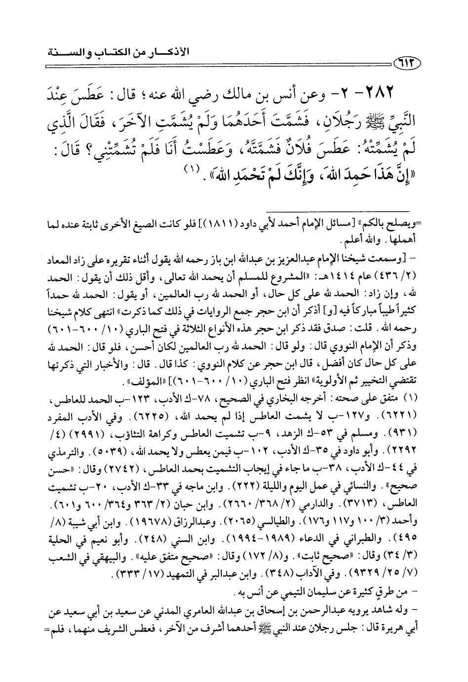 ٢٨٢ - ٢ - وعن أنس بن مالك رضي الله عنه؛ قال: عَطَسَ عِنْدَ النَّبِيِّ صلى الله عليه وسلم رَجُلَانِ، فَشَمَّتَ أَحَدَهُمَا وَلَمْ يَشَمَّتِ الآخَرَ، فَقَالَ الَّذِي لَمْ يُشَمِّتْهُ: عَطَسَ فُلَانٌ فَشَمَّتَّهُ، وَعَطَسْتُ أَنَا فَلَمْ تُشَمِّتْنِي؟ قَالَ: «إِنَّ هَذَا حَمِدَ اللهَ، وَإِنَّكَ لَمْ تَحْمَدِ اللهَ» (¬١) .