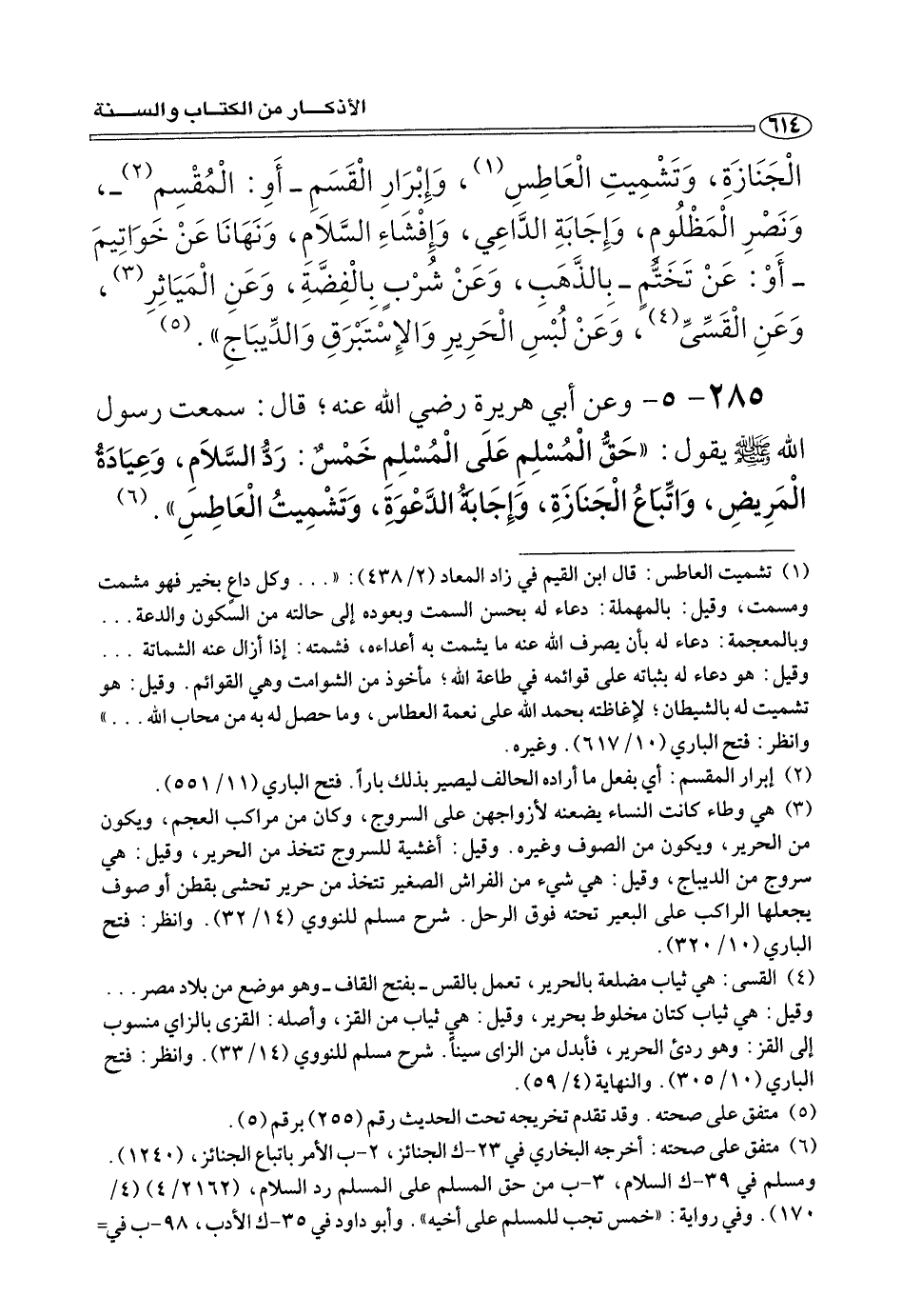 ٢٨٥ - ٥ - وعن أبي هريرة رضي الله عنه؛ قال: سمعت رسول الله صلى الله عليه وسلم يقول: «حَقُّ الْمُسْلِمِ عَلَى الْمُسْلمِ خَمْسٌ: رَدُّ السَّلَامِ، وَعِيَادَةُ الْمَريضِ، وَاتِّبَاعُ الْجَنَازَة، وَإِجَابَةُ الدَّعْوَةَ، وَتَشْمِيتُ الْعَاطِسِ». (¬٦)