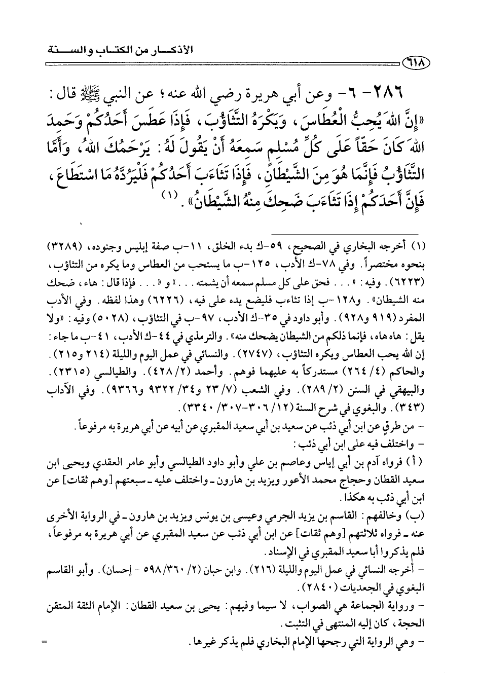 ٢٨٦ - ٦ - وعن أبي هريرة رضي الله عنه؛ عن النَّبِيَّ صلى الله عليه وسلم قال: «إِنَّ اللهَ يُحِبُّ الْعُطَاسَ، وَيَكْرَهُ التَّثَاؤُبَ، فَإِذَا عَطَسَ وَحَمِد اللهَ كَانَ حقً عَلَى كُلِّ مُسْلِمٍ سَمِعَهُ أَنْ يَقُولَ لَهُ: يَرْحَمُكَ اللهَ، وَأَمَّا التَّثَاؤُبُ: فَإِنَّمَا هُوَ مِنَ الشَّيْطَانِ، فَإِذَا تَثَاءَبَ أَحُدكُمْ فَلْيَرُدَّهُ مَا اسْتَطَاعَ، فَإِنَّ أَحَدَكُم إِذَا تَثَاءَبَ ضَحِكَ مِنْهُ الشَّيْطَانُ» (¬١) .