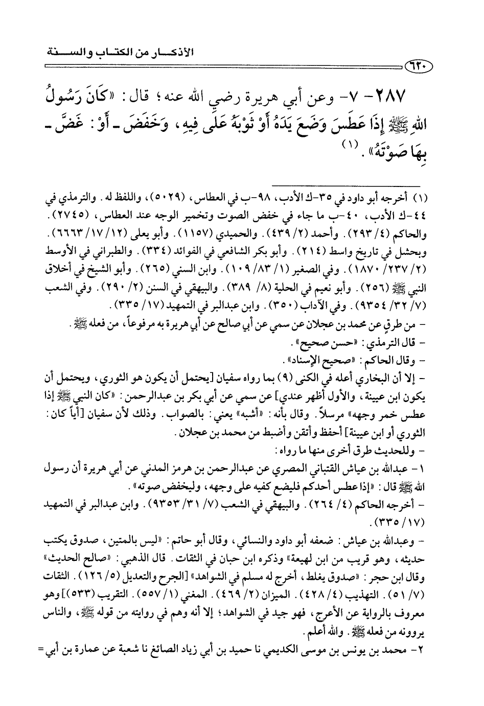 ٢٨٧ - ٧ - وعن أبي هريرة رضي الله عنه؛ قال: «كَانَ رَسُولُ اللهِ صلى الله عليه وسلم إِذَا عَطَسَ وَضَعَ يَدَهُ أَوْ ثَوْبَهُ عَلَى فِيهِ، وَخَفَضَ- أَوْ غَضَّ- بِهَا صَوْتَهُ.» (¬١)