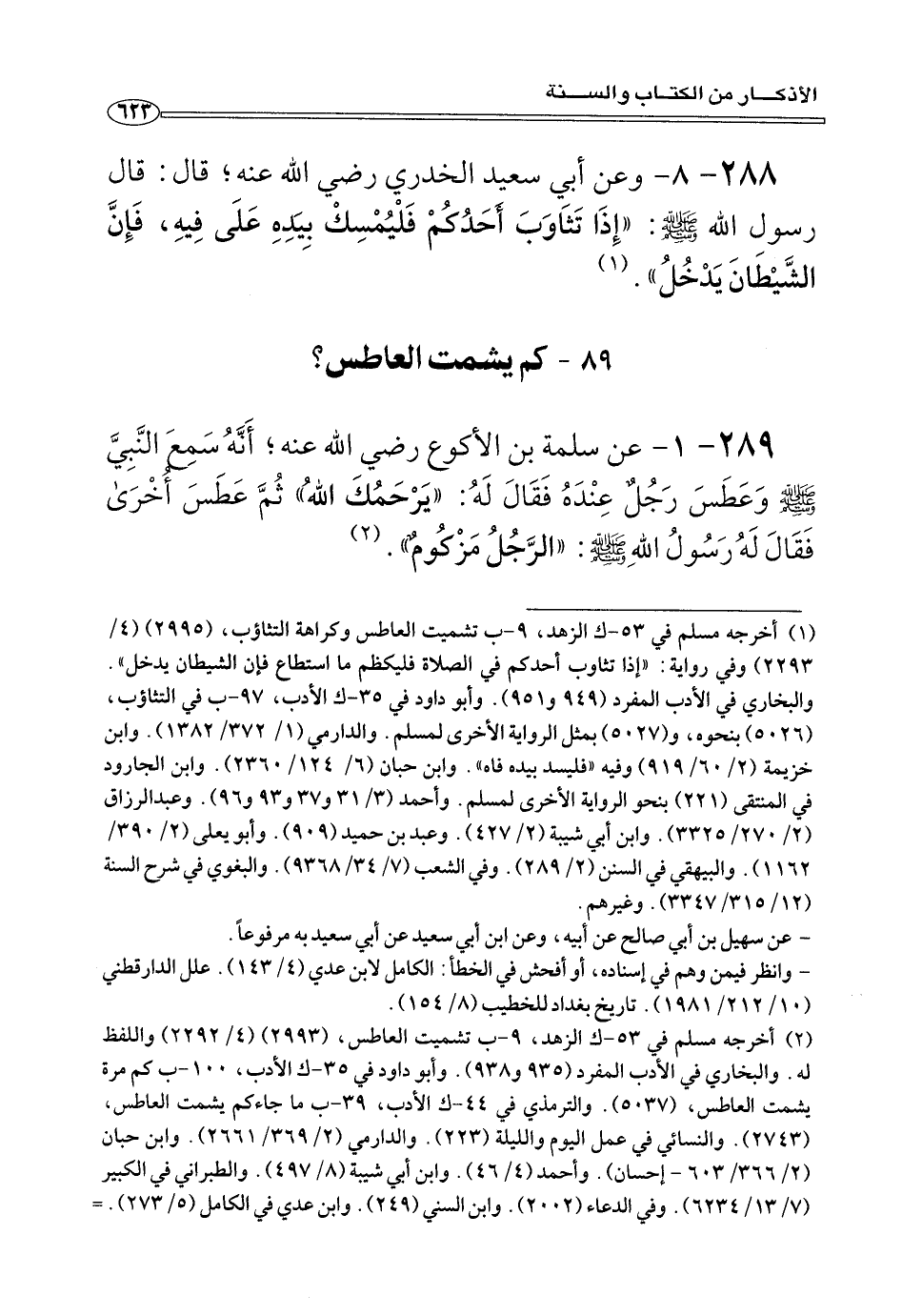 ٢٨٨ - ٨ - وعن أبي سعيد الخدري رضي الله عنه؛ قال: قال رسول الله صلى الله عليه وسلم: «إِذَا تَثَاوَبَ أَحَدُكُمْ فَلْيُمْسِكْ بِيَدِهِ عَلَى فِيهِ، فَإِنَّ الشَّيْطَانَ يَدْخُلُ» (¬١).