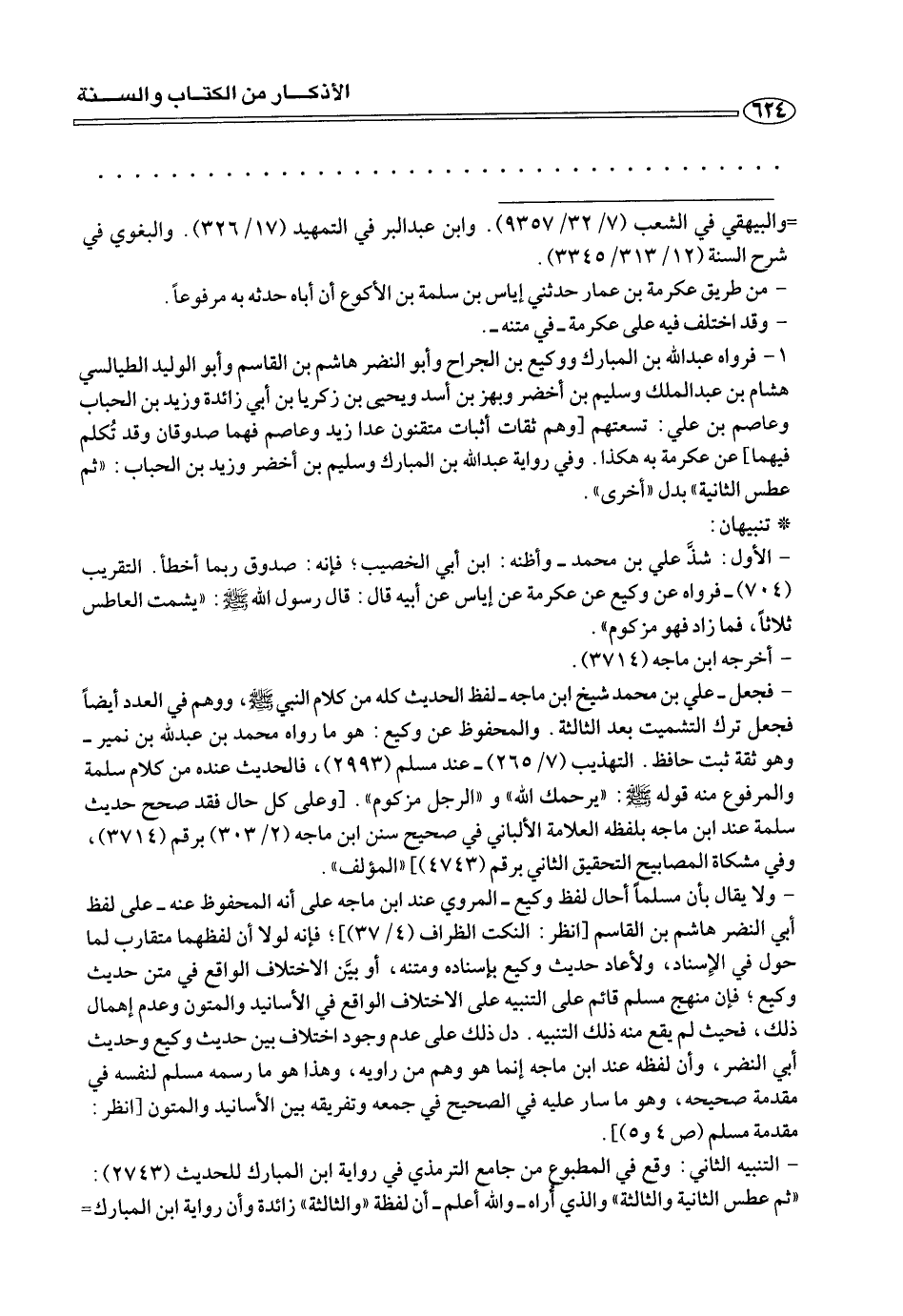 ١ - فرواه عبد الملك بن المبارك ووكيع بن الجراح وأبو النصر هاشم بن القاسم وأبو الوليد الطيالسي هشان بن عبد الملك وسليم بن أخضر وبهز بن أسد ويحيى بن زكريا بن أبي زائدة وزيد بن الحباب وعاصم بن علي: تسعتهم [وهم ثقات أثبات متقنون عد زيد وعاصم فهما صدوقان وقد تكلم فيهما] عن عكرمة به هكذا. وفي رواية عبد الله بن المبارك وسليم بن أخضر وزيد بن الحباب: «ثم عطس الثانية» بدل «اخرى».
