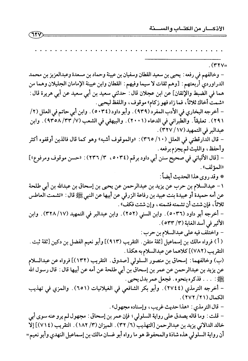 ١ - عبد السلام بن حرب عن يزيد بن عبد الرحمن عن يحيى بن إسحاق بن عبد الله بن أبى طلحة عن أمه حميدة أو عبيدة بنت عبيد بن رفاعة الزرقي عن أبيها عن النبي صلى الله عليه وسلم قال: «تشمت العاطس ثلاثا، فإن شئت أن تشمته فشمته، وإن شئت فكف».