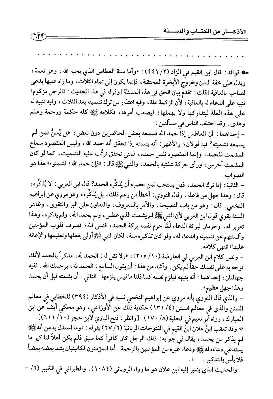 * وقد تعقب ابن علان ابن القيم في الفتوحات الربانية (٦/ ٢٧) بقوله: «وما استدل به من أنه صلى الله عليه وسلم لم يذكر من يحمد، يقال في جوابه: ذلك الرجل كان كافرا كما سبق فلم يكن أهلا لتذكير ما يستدعي دعاءه له صلى الله عليه وسلم ودعاء غيره من المؤمنين بالرحمة. أما المؤمنون فكالبنيان يشد بعضه بعضا فلا بأس بالتذكير ... ».