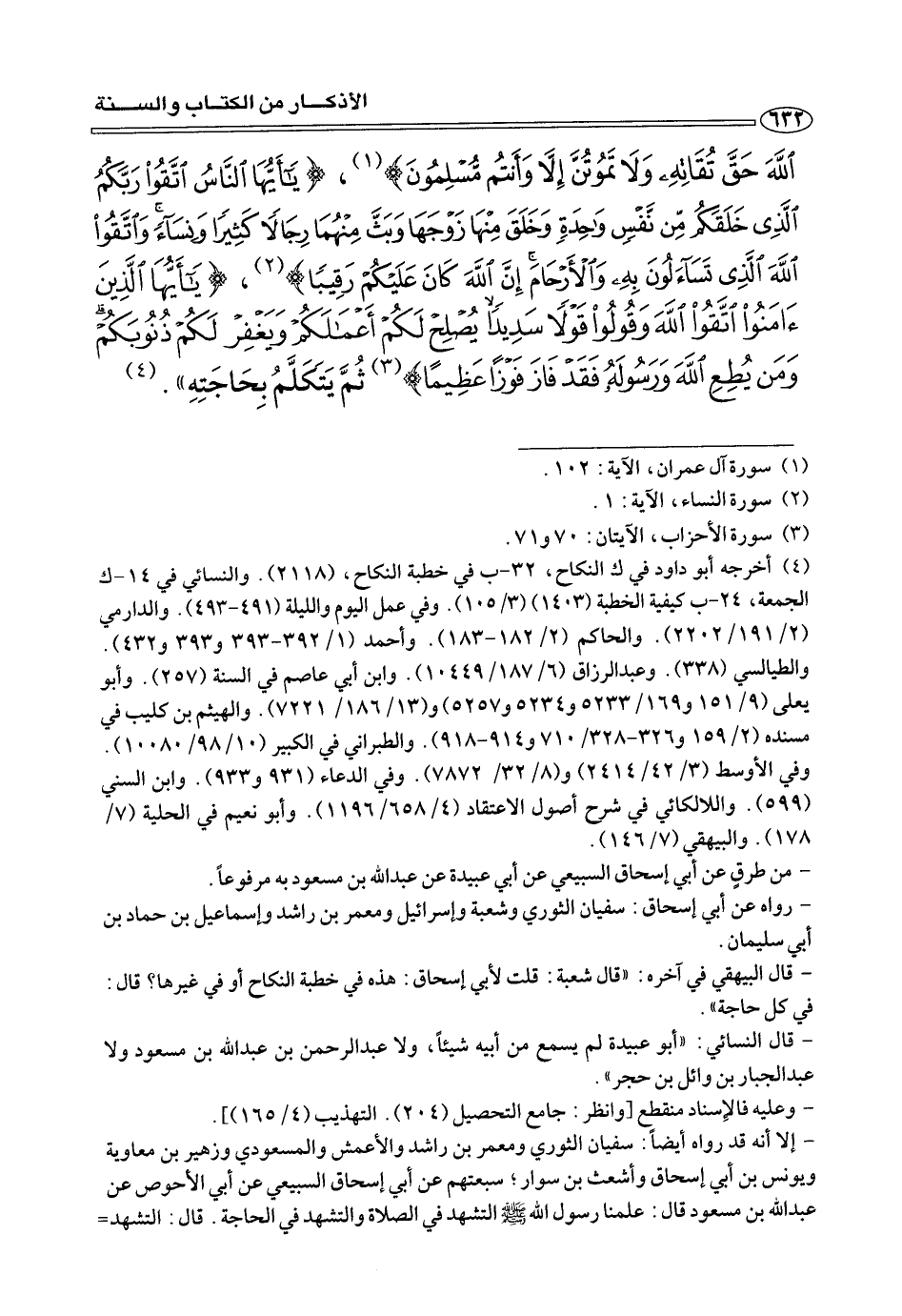 (¬٤) أخرجه أبو داود في ك النكاح، ٢٣ - ب في خطبةالنكاح، (٢١١٨). والنسائي في ١٤ - ك الجمعة، ٢٤ - بكيفية الخطبة (١٤٠٣) (٣/ ١٠٥). وفي عمل اليوم والليلة (٤١٩ - ٤٩٣). والدرامي (٢/ ١٩١/ ٢٢٠٢). والحاكم (٢/ ١٨٢ - ١٨٣). وأحمد (١/ ٣٩٢ - ٣٩٣ و ٣٩٤ و ٤٣٢). والطيالسي (٢٣٨). وعبد الرازق (٦/ ١٨٧/ ١٠٤٤٩). وابن أبى عصام في السنة (٢٥٧). وأبو يعلي (٩/ ١٥١ و ١٦٩/ ٥٢٣٣ و ٥٢٣٤/ ٥٢٥٧) و (١٣/ ١٨٦/ ٧٢٢١). والهيثم بن كليب في مسنده (٢/ ١٥٩ و ٣٢٦ - ٣٢٨/ ٧١٠ و ٩١٤ - ٩١٨). والطبراني في الكبير (١٠/ ٩٨/ ١٠٠٨٠). وفي الأوسط (٣/ ٤٢/ ٢٤١٤) و (٨/ ٣٢/ ٧٨٧٢). وفي الدعاء (٩٣١ و ٩٣٣). وابن السني (٥٩٩). واللالكائي فى شرح أصول الاعتقاد (٤/ ٦٥٨/ ١١٩٦). وأبو نعيم في الحلية (٧/ ١٧٨). والبيهقي (٧/ ١٤٦).
