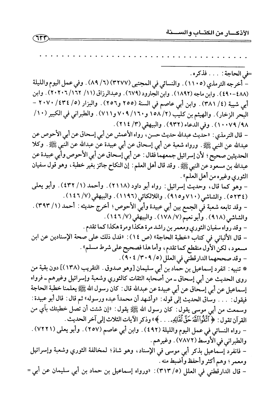 * تنبيه: انفرد إسماعيل بن حماد بن أبي سليمان [وهو صدوق. التقريب (١٣٨)] دون بقية من روى الحديث عن أبي إسحاق- من أصحابه الثقات كالثوري وشعبة وإسرائيل وغيرهم- فرواه إسماعيل عن أبي إسحاق عن أبي عبيدة عن عبد الله قال: كان رسول الله صلى الله عليه وسلم يعلمنا خطبة الحاجة فيقول: .... وساق الحديث إلى قوله» وأشهد أن محمدا عبده ورسوله «ثم قال: قال أبو عبيدة: وسمعت من أبي موسى يقول: كان رسول الله صلى الله عليه وسلم يقول: «إن شئت أن تصل خطبتك بآي من القرآن تقول: (اتقوا الله حق تقاته) «وذكر الآيات الثلاث إلى آخر الحديث.