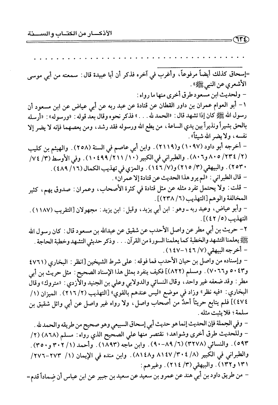 ١ - أبو العوام عمران بن دوار القطان عن قتادة عن عبد ربه عن أبي عياض عن ابن مسعود أن رسول الله صلى الله عليه وسلم كان إذا تشهد قال: «الحمد لله .... » فذكر نحوه وقال بعد قوله:» ورسوله «:» أرسله بالحق بشيرا ونذيرا بين يدي الساعة، من يطع الله ورسوله فقد رشد، ومن يعصهما فإنه لا يضر إلا نفسه، ولا يضر الله شيئا «.