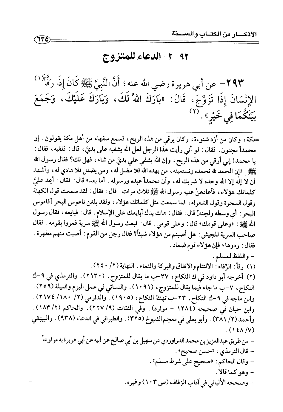 (¬٢) أخرجه أبو داود في ك النكاح، ٣٧ - ب ما يقال للمتزوج، (٢١٣٠). و الترمذي في ٩ - ك النكاح، ٧ - ب ما جاء فيها يقال للمتزوج، (١٠٩١). والنسائي في عمل اليوم والليلة (٢٥٩). وابن ماجد في ٩ - ك النكاح، ٢٣ - ب تهنئة النكاح، (١٩٠٥). والدرامي (٢/ ١٨٠/ ٢١٧٤). وابن حبان في صحيحه (١٢٨٤ - موارد). وفي الثقات (٩/ ٢٢٧). والحاكم (٢/ ١٨٣). وأحمد (٢/ ٣٨١). وأبو يعلي في معجم الشيوخ (٣٢٥). والطبراني في الدعاء (٩٣٨). والبيهقي (٧/ ١٤٨).