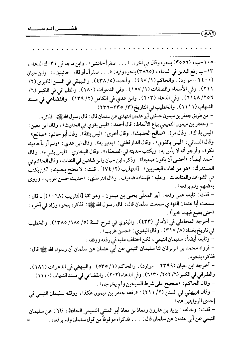 - وجعفر بن ميمون التميمي بياع الأنماط: قال أحمد: «ليس بقوي في الحديث»، وقال ابن معين: «ليس بذاك». وقال مرة: «صالح الحديث». وقال أخرى: «ليس بثقة». وقال أبو حاتم: «صالح». وقال النسائي: «ليس بالقوي». وقال الدارقطني: «يعتبر به». وقال ابن عدي: «ولم أر بأحاديثه نكرة، وأرجو أنه لا بأس به، ويكتب حديثه في الضعفاء». وقال البخاري: «ليس بشيء». وقال أحمد أيضًا: «أخشى أن يكون ضعيفًا». وذكره ابن حبان وابن شاهين في الثقات، وقال الحاكم في المستدرك: «هو من ثقات البصريين». [التهذيب (٢/ ٧٤)]. قلت: لا يحتج بحديثه، لكن يكتب في الشواهد والمتابعات. وعليه: فإسناده ضعيف. وقال الرمذي: «حديث حسن غريب، وروى بعضهم وَلَمْ يرفعه».