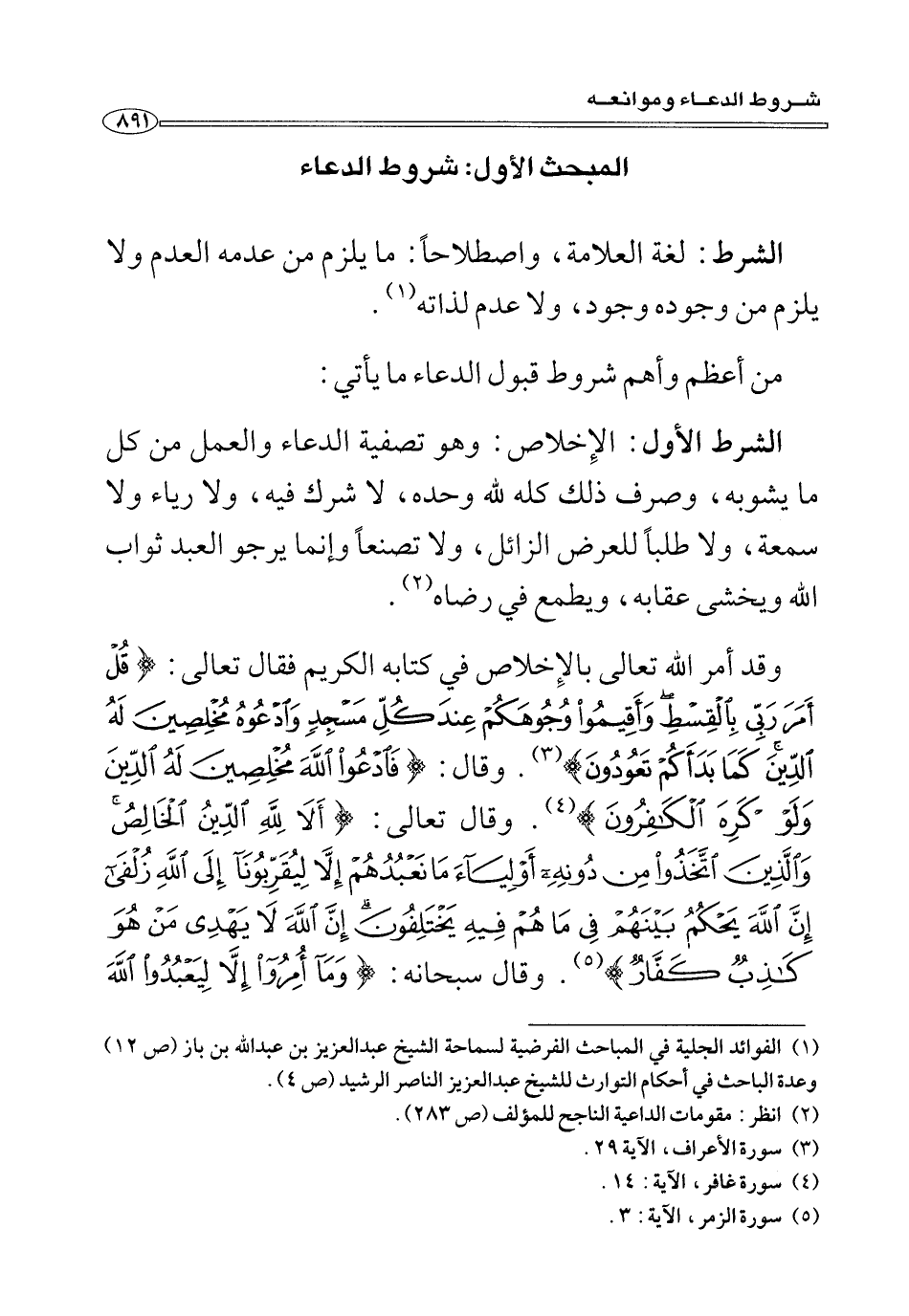 الشرط الأول: الإخلاص: وَهُوَ تصفية الدعاء والعمل من كل مَا يشوبه، وصرف ذَلِكَ كله لله وحده، لَا شرك فيه، وَلَا رياء وَلَا سمعة، وَلَا طلبًا للعرض الزائل، وَلَا تصنعًا وإنما يرجو العبد ثواب الله ويخشى عقابه، ويطمع فِي رضاه (¬٢).