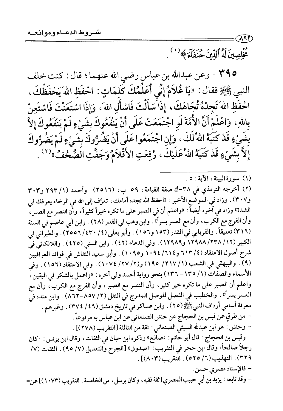 ٣٩٥ - وعن عبد الله بن عباس رضي الله عنهما؛ قَالَ: كُنْتُ خلف النبي صلى الله عليه وسلم فقَالَ: «يَا غُلَامُ إِنِّي أُعَلِّمُكَ كَلِمَاتٍ: احفَظِ اللهَ يَحْفَظْكَ، احْفَظِ اللهَ تَجِدْهُ تُجَاهَكَ، إِذَا سأَلْتَ فَاسْأَلِ اللهَ، وَإِذَا اسْتَعَنْتَ فَاسْتَعِنْ بِاللهِ، وَاعْلَمْ أَنَّ الأُمَّةَ لَوِ اجْتَمَعَتْ عَلَى أَنْ يَنْفَعُوكَ بِشَيْءٍ لَمْ يَنْفَعُوكَ إِلَّا بِشَيْءٍ قَدْ كَتَبَهُ اللهُ لَكَ، وَإِنِ اجْتَمَعُوا عَلَى أَنْ يَضُرُّوكَ بِشَيْءٍ لَمْ يَضُرُّوكَ إِلَّا بِشَيْءٍ قَدْ كَتَبَهُ اللهُ عَلَيْكَ، رُفِعَتِ الأَقْلَامُ وَجَفَّتِ الصُّحُفُ» (¬٢) .