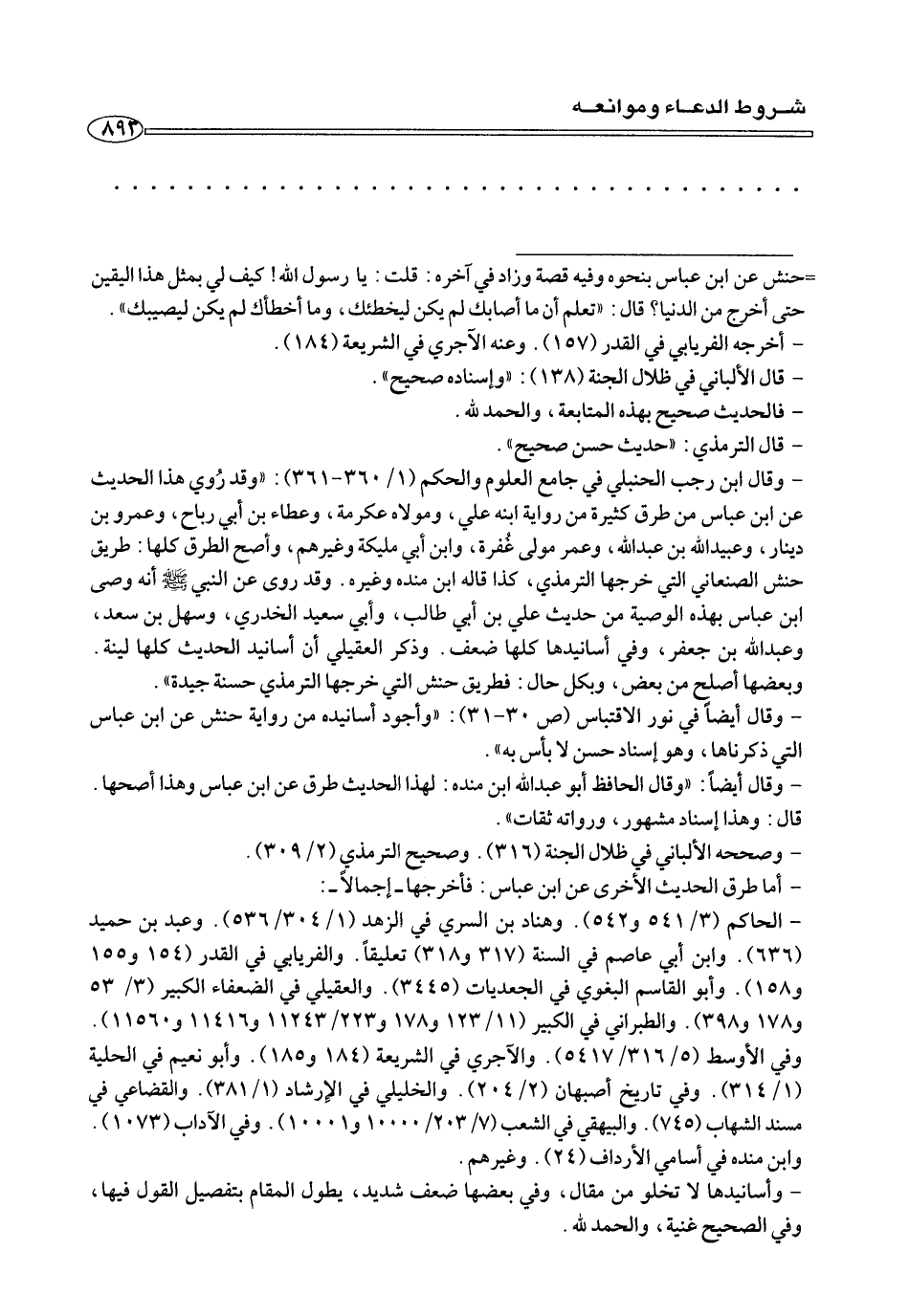 =حنش عن ابن عباس بنحوه وفيه قصة وزاد في آخره: قلت: يا رسول الله! كيف لي بمثل هذا اليقين حتى أخرج من الدنيا؟ قال: «تعلم أن ما أصابك لم يكن ليخطئك لن يكن ليصيبك».
