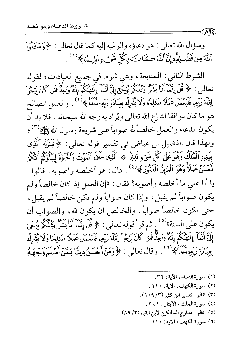 الشرط الثاني: المتابعة، وهي شرط فِي جميع العبادات؛ لقوله تعالى: {قل إِنَّمَا أنا بشر مثلكم يوحى إلي إِنَّمَا إلهكم إله واحد فمن كَانَ يرجو لقاء ربه فليعمل عملًا صالحًا وَلَا يشرك بعبادة ربه أحد} (¬٢) . والعمل الصالح هُوَ مَا كَانَ موافقا لشرْع اللهُ تَعَالَى ويُراد بِهِ وجه الله سبحانه. فلا بد أن يكون الدعاء العمل خالصًا صوابًا عَلَى شريعة رسول الله صلى الله عليه وسلم (¬٣) ؛ ولهذا قَالَ الفضيل بن عياض فِي تفسير قوله تعالى: {تبرك الَّذِي بيده الملك وَهُوَ عَلَى كل شَيْءٍ قَدْير * الَّذِي خلق الموت والحياة ليبلوكم ايكم أحسن عملًا وَهُوَ العزيز الغفور} (¬٤) . قَالَ: هُوَ أخلصه وأصوبه, قَالَوا: يَا أبا علي مَا أخلصه وأصوبه؟ فقَالَ: «إن العمل إِذَا كَانَ خالصًا وَلَمْ يكون صوابًا لَمْ يقبل، وَإِذَا كَانَ صوابًا ولن يكن خالصًا وَلَمْ يكون صوابًا لَمْ يقبل، وَإِذَا كَانَ صوابًا وَلَمْ يكن خالصًا لَمْ يقبل، حَتَّى يكون خالصًا صوابًا. والخالص أن يكون لله، والصواب أن يكون عَلَى السنة» (¬٥) . ثُمَّ قرأ قوله تعالى: {قل إِنَّمَا أنا بشر مثلكم يوحى إلي إِنَّمَا إلهكم إله واحد فمن كَانَ يرجوا لقاء ربه فليعمل عملًا صالحًا وَلَا يشرك بعبادة ربه أحدا} (¬٦) . وقَالَ تعالى: {ومن أحسن دينًا ممن أسلم وجهه