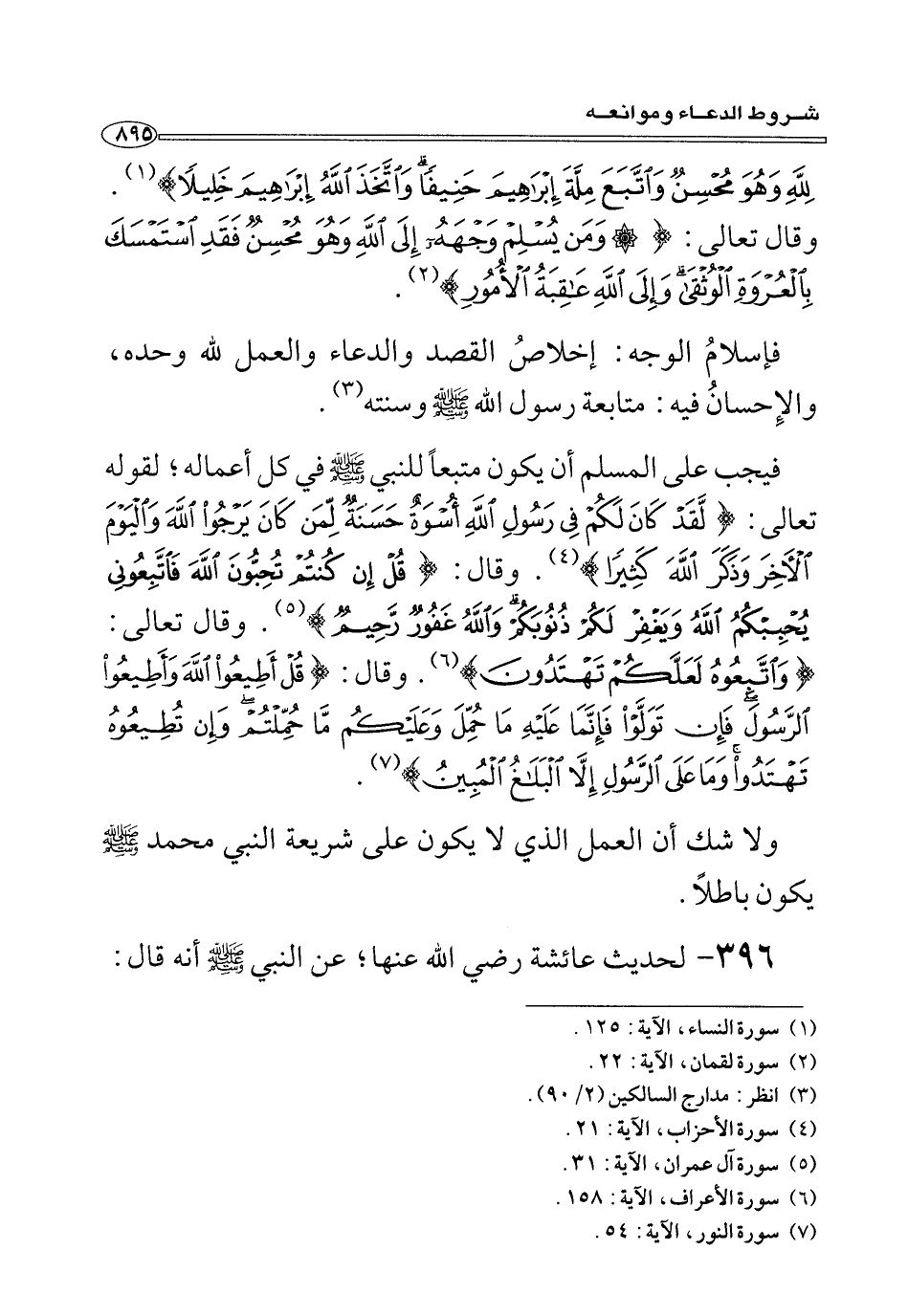 فيجب عَلَى المسلم أن يكون متبعًا للنبي صلى الله عليه وسلم فِي كل أعماله؛ لقوله تعالى: {لقد كَانَ لكم فِي رسو الله أسوة حسنة لمن كَانَ يرجوا الله واليوم الآخر وذكر الله كثيرًا} (¬٤) . وقَالَ: {قل إن كنتم تحبون الله فاتبعوني يحببكم الله ويغفر لكم ذنوبكم والله غفور رحيم} (¬٥) . وقَالَ تعالى: {واتبعوه لعلكم تهتدون} (¬٦) . وقَالَ: {قل أطيعوا الله وأطيعوا الرسول فَإِنْ تولوا إِنَّمَا عَلَيْهِ مَا حمل وعليكم مَا حملتم وإن تطيعوه تهتدوا وَمَا عَلَى الرسول إلا البلاغ المبين} (¬٧) .
