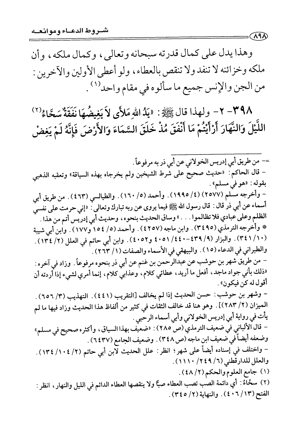 ٣٩٨ - ٢ - ولهذا قَالَ صلى الله عليه وسلم: «يَدُ اللهِ مَلأَى لَا يَغِضُهَا نَفَقَةٌ سَحَّاءُ (¬٢) اللَّيْلِ وَالنَّهَارَ أَرْأَيْتُمْ مَا أَنْفَقَ مُنْذُ خَلَقَ السَّمَاءَ وَالأَرْضَ فَإِنَّهُ لَمْ يَغِضْ