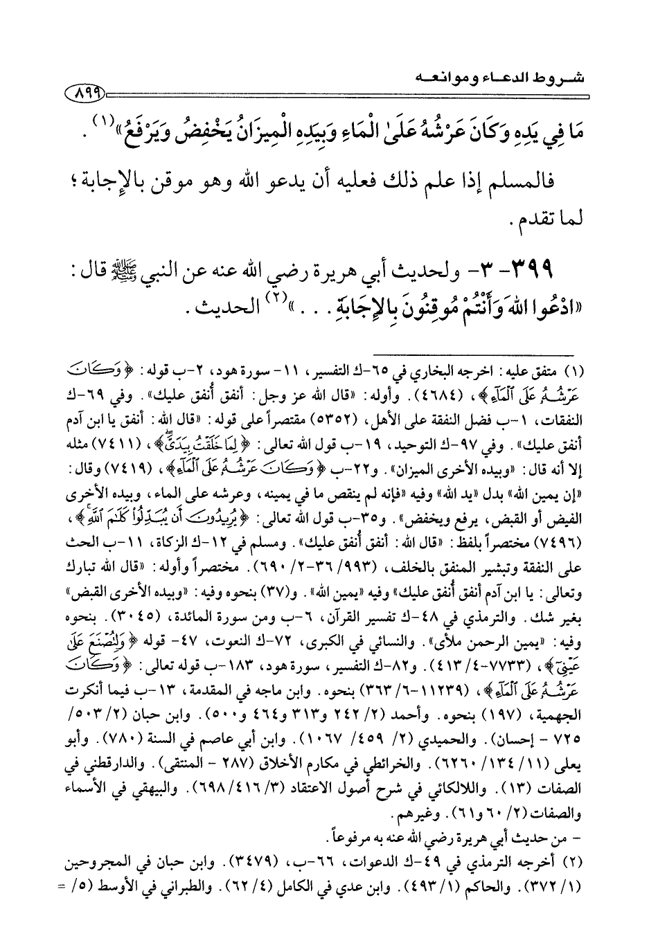 ٣٩٩ - ٣ - ولحديث أَبِي هريرة رضي الله عنه عن النبي صلى الله عليه وسلم قَالَ: «ادْعُوا اللهَ وَأَنْتُمْ مُوقِنُونَ بِالإِجَابَةِ ... » (¬٢) الحديث.