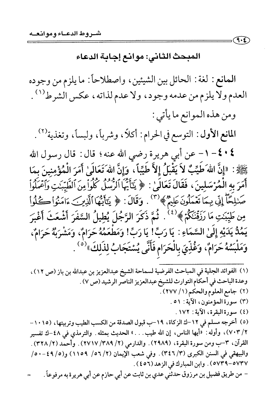 ٤٠٤ - ١ - عن أَبِي هريرة رضي الله عنه؛ قَالَ: قَالَ رسول الله صلى الله عليه وسلم: «إِنَّ اللهَ طَيِّبٌ لَا يَقْبَلُ إِلَّا طَيِّبًا، وَإِنَّ اللهُ تَعَالَى أَمَرَ الْمُؤْمِنِينَ بِمَا أَمَرَ بِهِ الْمُرْسَلِينَ، فَقَالَ تَعَالَى: {يا أيها الرسل كلوا من الطيبات واعملوا صالحًا إني بما تعملون عليم} (¬٣). وَقَالَ: {يا أيها الَّذِين أمنوا كلوا من طيبات مَا رزقناكم} (¬٤). ثُمَّ ذَكَرَ الرَّجُل يُطِيلُ السَّفَرَ أَشْعَثَ أَغْبرَ يَمُدُّ يَدَيْهِ إِلَى السَّمَاءِ: يَا رَبِّ! يَا رَبِّ! وَمَطْعَمُهُ حَرَامٌ، وَمَشْرَبُهُ حَرَامٌ، وَمَلْبَسُهُ حَرَامٌ، وَغُذِّيَ بِالْحَرَامِ فَأَنَّى يُسْتَجَابُ لِذَلِكَ» (¬٥).