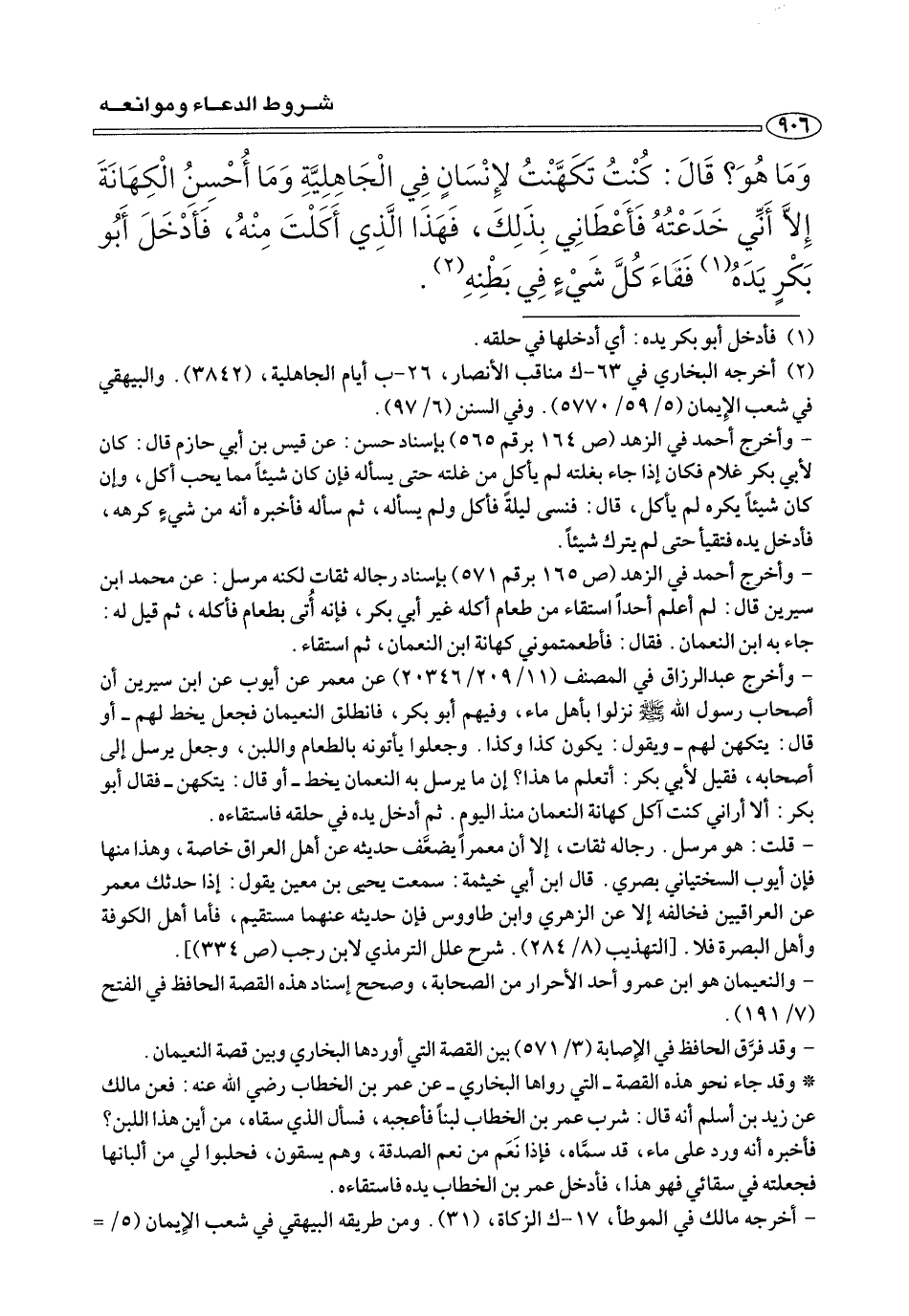 - وأخرج أحمد في الزهد (ص ١٦٥ برقم ٥٧١) بإسناد رجاله ثقات لكنه مرسل: عن محمد ابن سيرين قال: لم أعلم أحدًا استقاء من طعام أكله غير أبي بكر، فإنه أُتى بطعام فأكله، ثم قيل له: جاء به ابن النعمان. فقال: فأطعمتموني كهانة ابن النعمان، ثم استقاء.
