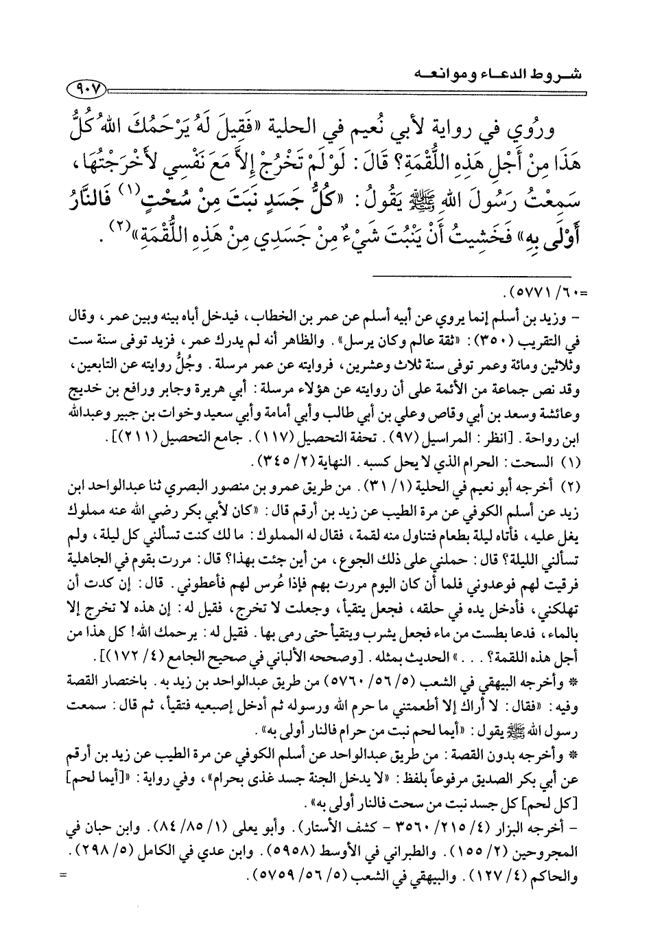 ورُوي فِي رواية لأبي نُعيم فِي الحلية» فَقِيلَ لَهُ يَرْحَمُكَ اللهُ كُلُّ هَذَا مِنْ أَجْلِ هَذِهِ اللُّقْمَةِ؟ قَالَ: لَوْ لَمْ تَخْرُجْ إِلَّا مَعَ نَفْسِي لأَخْرَجْتُهَا، سَمِعْتُ رَسُولَ اللهِ صلى الله عليه وسلم يَقُولُ: «كُلُّ جَسَدٍ نَبَتَ مِنْ سُحْتٍ (¬١) فَالنَّارُ أَوْلَى بِهِ» فَخَشِيتُ أَنْ يَنْبُتَ شَيْءٍ مِنْ جَسَدِي مِنْ هَذِهِ اللُّقْمَةِ» (¬٢).