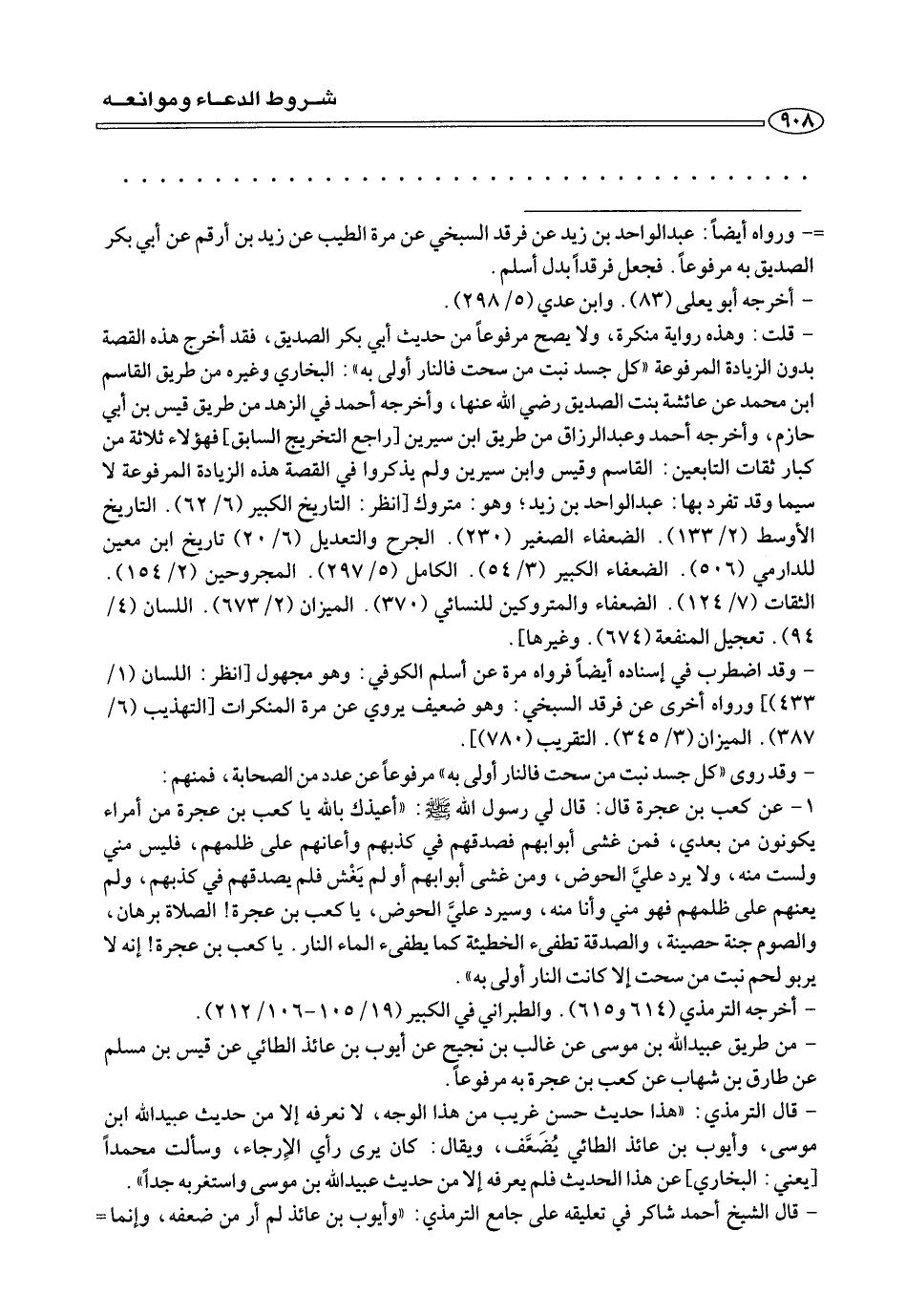 ١ - عن كعب بن عجرة قال: قال لي رسول الله صلى الله عليه وسلم: «أعيذك بالله يا كعب بن عجرة من أمراء يكونون من بعدي، فمن غشى أبوابهم فصدقهم في كذبهم وأعانهم على ظلمهم، فليس مني ولست منه، ولا يرد عليَّ الحوض، ومن غشى أبوابهم أول يَغْش فلم يصدقهم في كذبهم، وَلَمْ يعنهم على ظلمهم فهو مني وأنا منه، وسيرد عليَّ الحوض، يا كعب بن عجرة! الصلاة برهان، والصوم جنة حصينة، والصدقى تطفئ الخطيئة كما يطفئ الماء النار. يا كعب بن عجرة! إنه لا يربو لحم نبت من سحت إلا كانت النار أولى به».