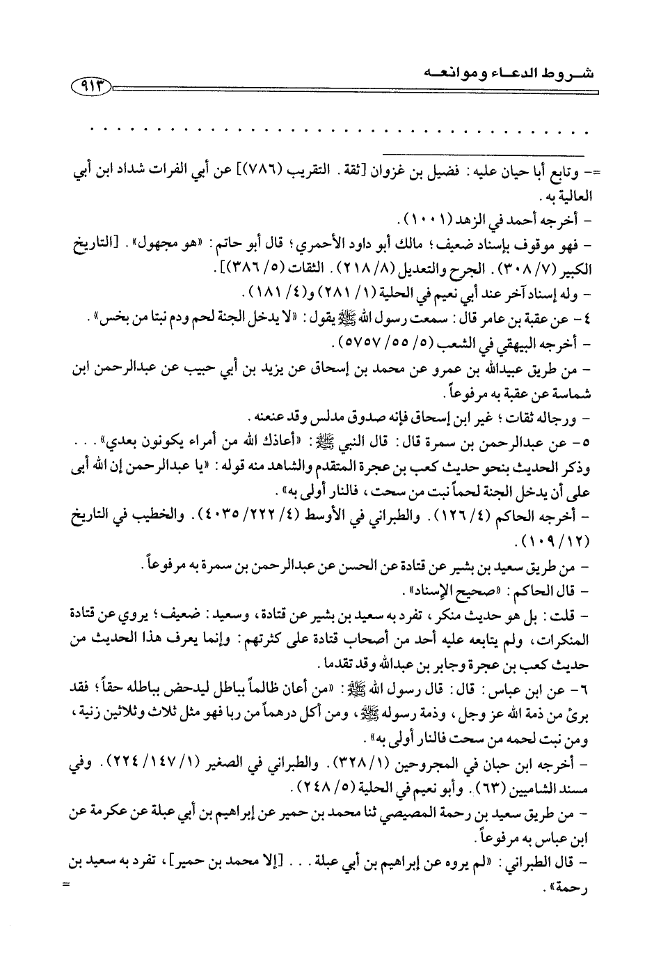 ٦ - عن ابن عباس: قال: قال رسول الله صلى الله عليه وسلم: «من أعان ظالمًا بباطل ليدحض بباطله حقًا؛ فقد برئ من ذمة الله عز وجل، وذمة رسوله صلى الله عليه وسلم، ومن أكل درهمًا من ربا فهو مثل ثلاث وثلاثين زنية، ومن نبت لحمه من سحت فالنار أولى به».
