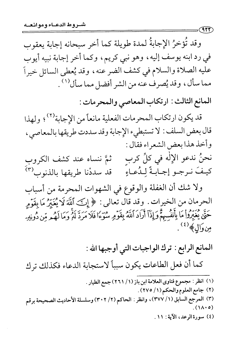 قد يكون ارتكاب المحرمات الفعلية مانعا من الإجابة (¬٢)؛ ولهذا قَالَ بعض السلف: لَا تستبطئ الإجابة وَقَدْ سددت طريقها بالمعاصي، وأخذ هَذَا بعض الشعراء فقَالَ: