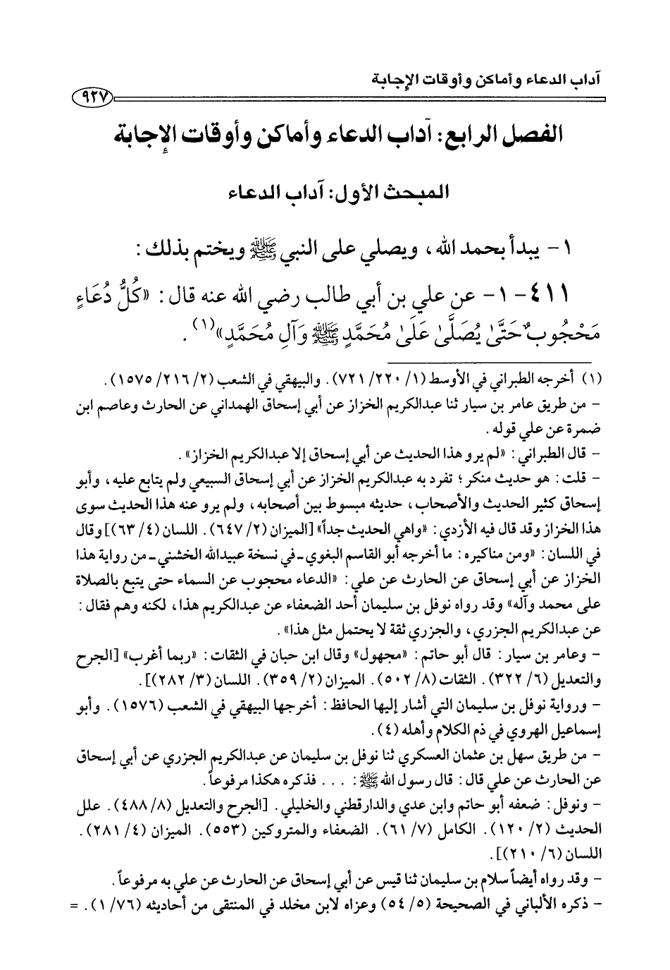 - قلت: هو حديث منكر؛ تفرد به عبد الكريم الخزاز عن أبي إسحاق السبيعي وَلَمْ يتابع عليه، وأبو إسحاق كثير الحديث والأصحاب، حديثه مبسوط بين أصحابه، وَلَمْ يرو عنه هذا الحديث سوى هذا الخزاز وقد قال فيه الأزدي: «واهي الحديث جدا» [الميزان (٢/ ٦٤٧). اللسان (٤/ ٦٣)] وقال في اللسان: «ومن مناكيره: ما أخرجه أبو القاسم البغوي- في نسخة عبيد الله الخشني- من رواية هذا الخزاز عن أبي إسحاق عن الحارث عن على: «الدعاء محجوب عن السماء حتى يتبع بالصلاة على محمد وآله» وقد رواه نوفل بن سليمان أحد الضعفاء عن عبد الكريم هذا، لكنه وهم فقال: عن عبد الكريم الجزري، والجزري ثقة لا يحتمل مثل هذا».