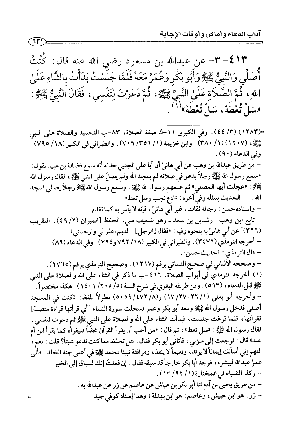 ٤١٣ - ٣ - عن عبد الله بن مسعود رضي الله عنه قَالَ: كُنْتُ أُصَلِّي وَالنَّبِيُّ صلى الله عليه وسلم وَأَبُو بَكْرٍ وَعُمَرُ مَعَهُ فَلَمَّا جَلَسْتُ بَدَأْتُ بِالثَّنَاءِ عَلَى اللهِ، ثُمَّ الصَّلَاةِ عَلَى النَّبِيَّ صلى الله عليه وسلم، ثُمَّ دَعَوْتُ لِنَفْسِي، فَقَالَ النَّبِيُّ صلى الله عليه وسلم: «سَلْ تُعْطَهْ، سَلْ تُعْطَهْ» (¬١) .