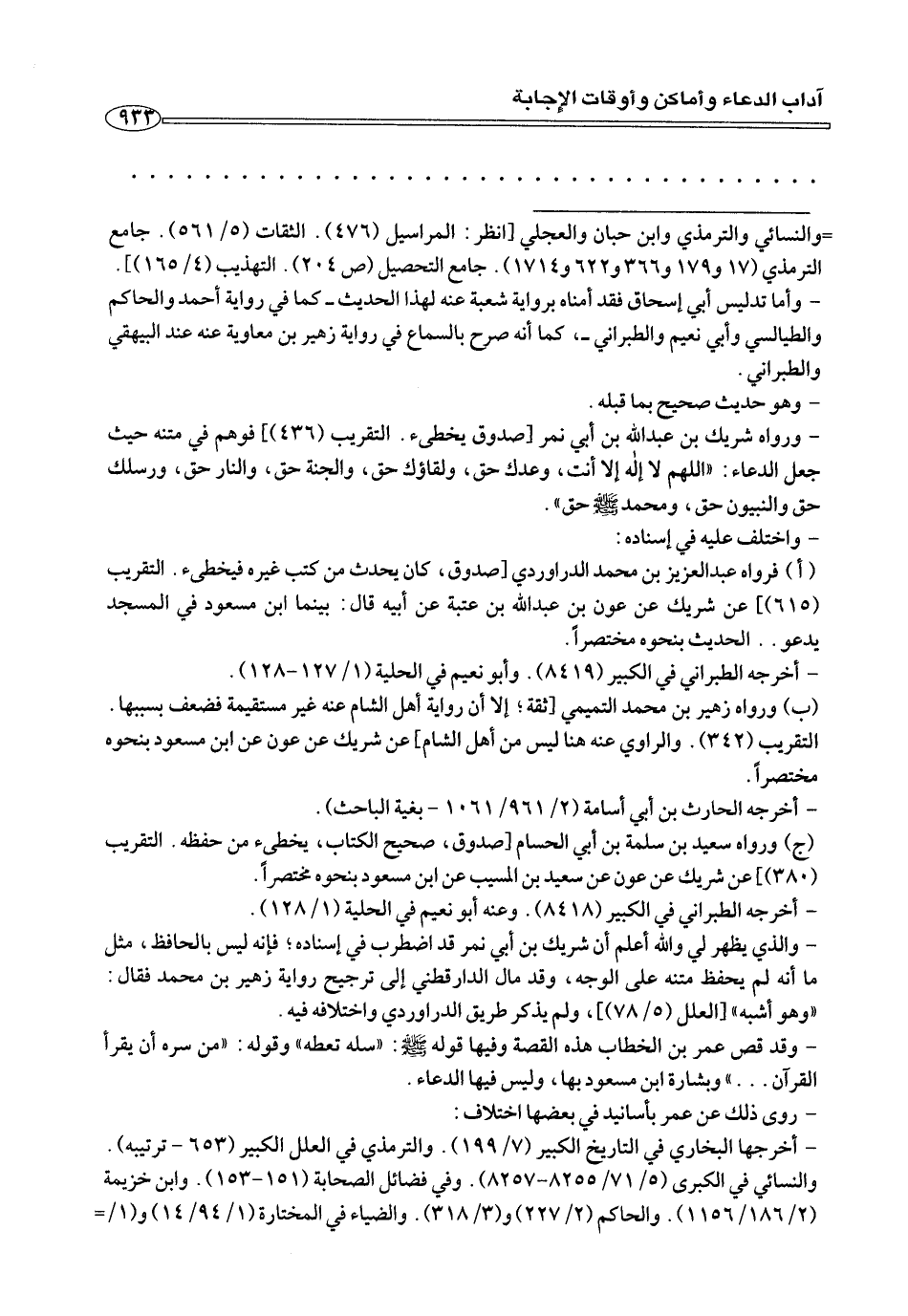 (أ) فرواه عبد العزيز بن محمد الدراوردي [صدوق، كان يحدث من كتب غيره فيخطي. التقريب (٦١٥)] عن شريك عن عون بن عبد الله بن عتبة عن أبيه قال: بينما ابن مسعود في المسجد يدعو .. الحديث بنحوه مختصرا.