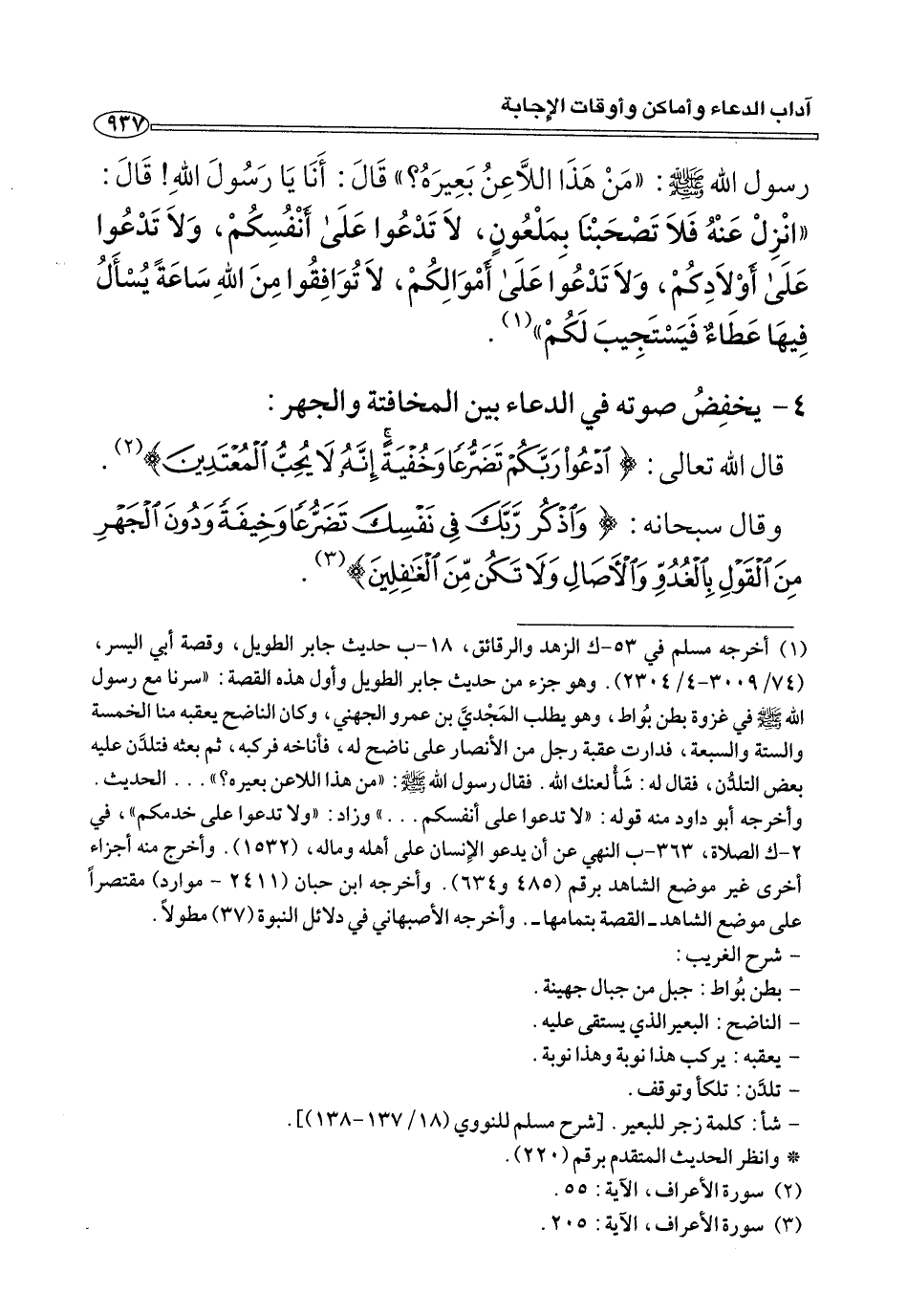 رسول الله صلى الله عليه وسلم: «مَنْ هَذَا اللَّاعِنُ بَعِيرَهُ؟» قَالَ: أَنَا يَا رَسُولَ اللهِ! قَالَ: «انْزِلْ عَنْهُ فَلَا تَصْحَبْنَا بِمَلْعُونٍ، لَا تَدْعُوا عَلَى أَنْفُسِكُمْ، وَلَا تَدْعُوا عَلَى أَوْلَادِكُمْ، وَلَا تَدْعُوا عَلَى أَمْوَالِكُمْ، لَا تُوَافِقُوا مِنْ اللهِ سَاعَةً يُسْأَلُ فِيهَا عَطَاءٌ فَيَسْتَجِيبَ لَكُمْ» (¬١).