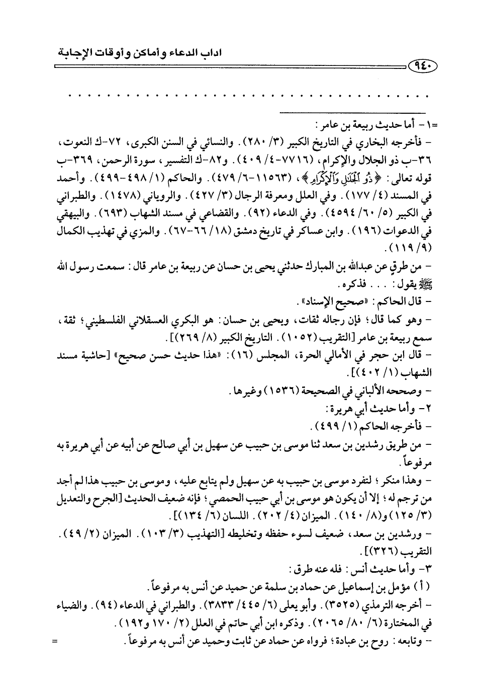 - فأخرجه البخاري في التاريخ الكبير (٣/ ٢٨٠). والنسائي في السنن الكبرى، ٧٢ - ك النعوت، ٣٦ - ب ذو الجلال والإكرام، (٧٧١٦ - ٤/ ٤٠٩). و ٨٢ - ك التفسير، سورة الرحمن، ٣٦٩ - ب قوله تعالى: {ذو الجلال والإكرام}، (١١٥٦٣ - ٦/ ٤٧٩). والحاكم (١/ ٤٩٨ - ٤٩٩). وأحمد في المسند (٤/ ١٧٧). وفي العلل ومعرفة الرجال (٣/ ٤٢٧). والروياني (١٤٧٨). والطبراني في الكبير (٥/ ٦٠/ ٤٥٩٤). وفي الدعاء (٩٢). والقضاعي في مسند الشهاب (٦٩٣). والبيهقي في الدعوات (١٩٦). وابن عساكر في تاريخ دمشق (١٨/ ٦٦ - ٦٧) والمزي في تهذيب الكمال (٩/ ١١٩).