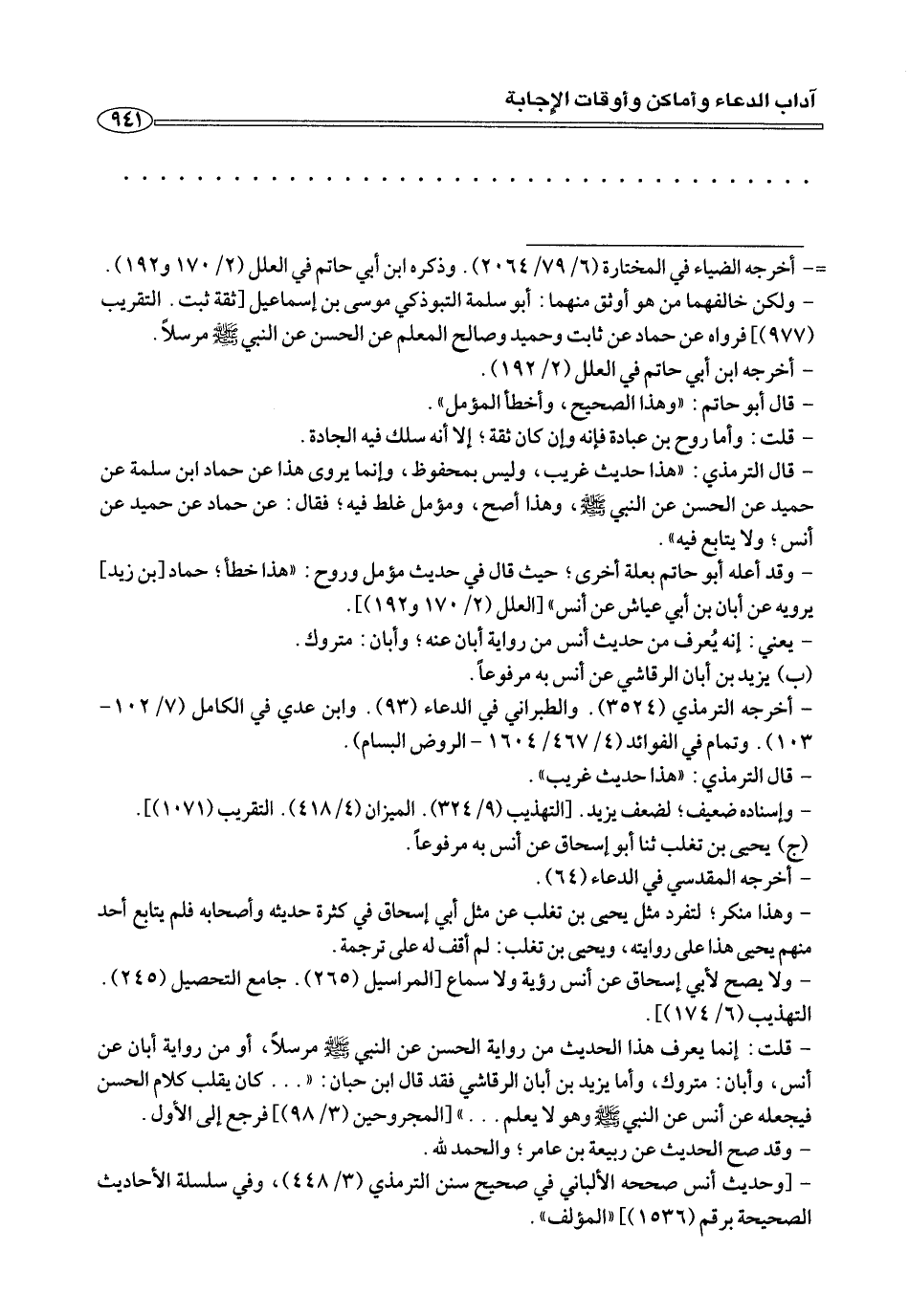 - وقد أعله أبو حاتم بعلة أخرى، حيث قال في حديث مؤمل وروح: «هذا خطأ؛ حماد [بن زيد] يرويه عن أبان بن أبي عياش عن أنس» [العلل (٢/ ١٧٠ و ١٩٢)].