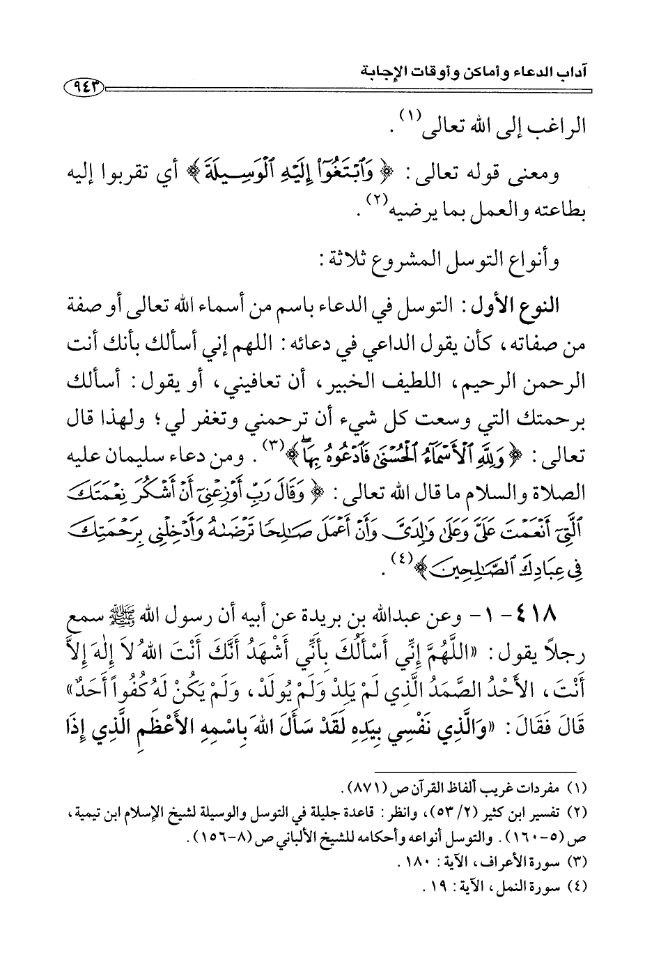 ٤١٨ - ١ - وعن عبد الله بن بريده عن أبيه أن رسول الله صلى الله عليه وسلم سمع رجلًا يَقُولُ: «اللَّهُمَّ إِنِّي أَسْأَلُكَ بِأَنِّي أَشْهَدُ أَنَّكَ أَنْتَ اللهُ لَا إِلهَ إِلَّا أَنْتَ، الأَحْدُ الصَّمَدُ الَّذِي لَمْ يَلِدْ وَلَمْ يُولَدْ، وَلَمْ يَكُنْ لَهُ كُفُوًا أَحَدٌ» قَالَ فَقَالَ: «وَالَّذِي نَفْسِي بِيَدِهِ لَقَدْ سَأَلَ اللهَ بِاسْمِهِ الأَعْظَمِ الَّذِي إِذَا