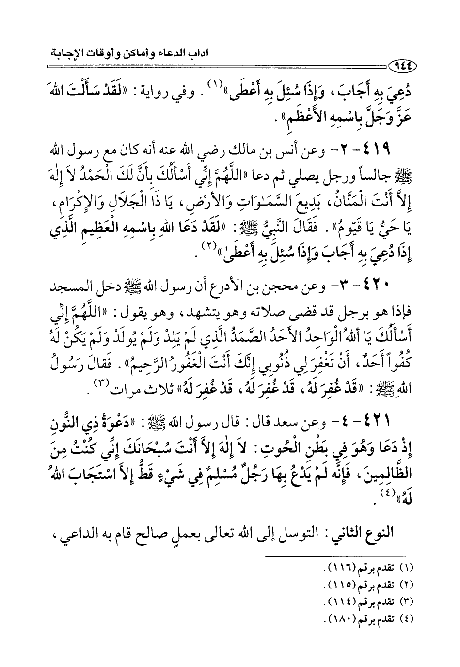 ٤١٩ - ٣ - وعن أنس بن مالك رضي الله عنه أنه كَانَ مَعَ رسول الله صلى الله عليه وسلم جالسًا ورجل يصلي ثُمَّ دَعَا «اللَّهُمَّ إِنِّي أَسْأَلُكَ بَأَنَّ لَكَ الْحَمْدُ لَا إِلَهَ إِلَّا أَنْتَ الْمَنَّانُ، بَدِيعَ السَّمَوَاتِ وَالأرْضِ، يَا ذَا الْجَلَالِ وَالإِكْرَامِ، يَا حَيُّ يَا قَيّومُ». فَقَالَ النَّبِيُّ صلى الله عليه وسلم: «لَقَدْ دَعَا اللهِ بِاسْمِهِ الْعَظِيمِ الَّذِي إِذَا دُعِيَ بِهِ أَجَابَ وَإِذَا سُئِل بِهِ أَعْطَى» (¬٢).
