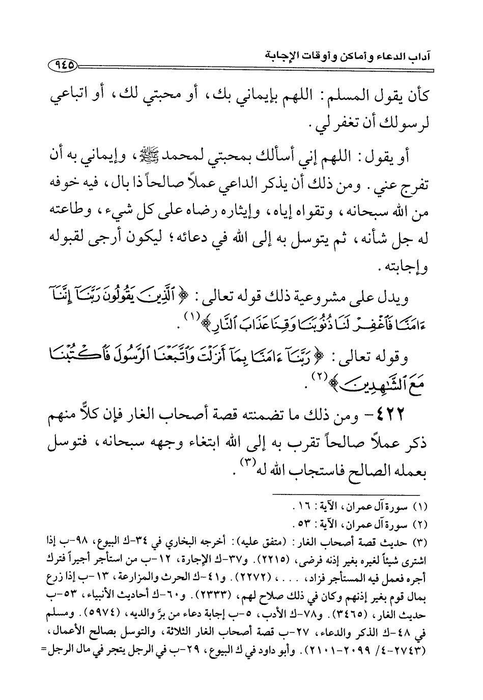 ٤٢٢ - ومن ذَلِكَ مَا تضمنته قصة أصحاب الغار فَإِنْ كلا منهم ذكر عملًا صالحًا تقرب بِهِ إِلَى الله ابتغاء وجهه سبحانه، فتوسل بعمله الصالح فاستجاب الله له (¬٣) .