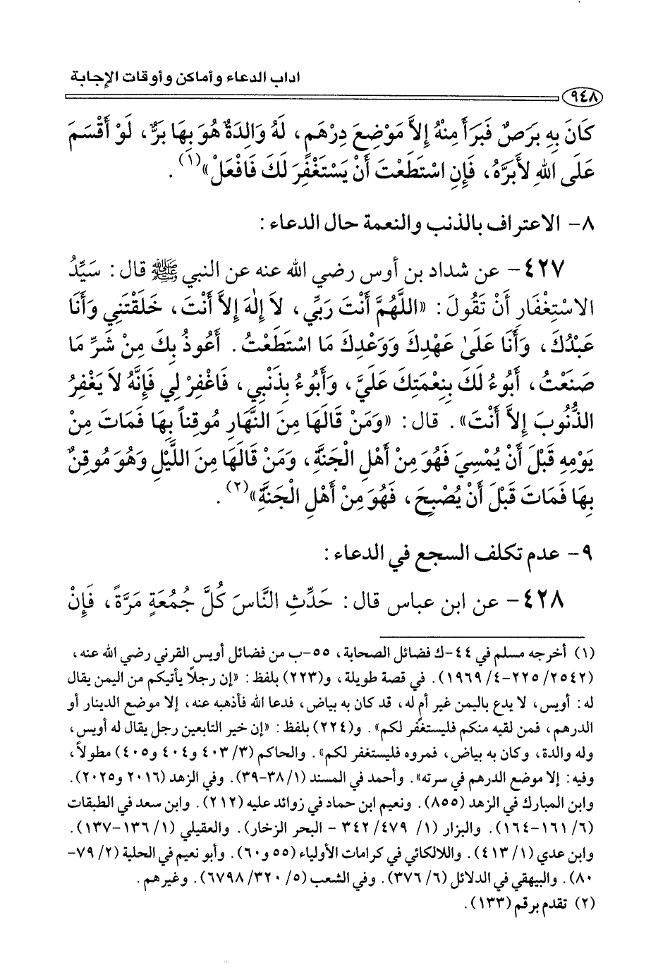 ٤٢٧ - عن شداد بن أوس رضي الله عنه عن النبي صلى الله عليه وسلم قَالَ: سَيِّدُ الاسْتِغْفَار أَنْ تَقُولَ: «اللَّهُمَّ أَنْتَ رَبِّي، لَا إِلهَ إِلَّا أَنْتَ، خَلَقْتَنِي وَأَنَا عَبْدُكَ، وَأَنَا عَلَى عَهْدِكَ وَوَعْدِكَ مَا اسْتَطَعْتُ. أَعُوذُ بِكَ مِنْ شَرِّ مَا صَنَعْتُ، أَبُوءُ لَكَ بِنِعْمَتِكَ عَلَيَّ، وَأَبُوءُ بِذَنْبِي، فَاغْفِرْ لِي فَإِنَّه لَا يَغْفِرُ الذُّنُوبَ إلا أَنْتَ». قَالَ: «وَمَنْ قَالَها مِنَ النَّهَارِ مُوقِنًا بِهَا فَمَاتَ مِنْ يَوْمِهِ قَبْلَ أَنْ يُمْسِيَ فَهُوَ مِنْ أَهْلِ الْجَنَّةِ، وَمَنْ قَالَها مِنْ اللَّيْلِ وَهُوَ مُوقِنٌ بِهَا فَمَاتَ قَبْلَ أَنْ يُصْبِحَ، فَهُوَ مِنْ أَهْلِ الْجَنَّةِ» (¬٢).