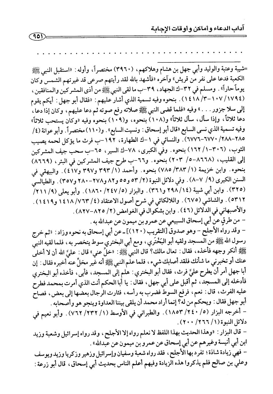 = شيبة وعتبة والوليد وأبي جهل بن هشام وهلاكهم، (٣٩٦٠) مختصرا، وأوله: «استقبل النبي صلى الله عليه وسلم الكعبة فدعا على نفر من قريش» وأخره» فأشهد بالله لقد رأيتهم صرعي قد غيرتهم الشمس وكان يوما حارا». ومسلم في ٣٢ - ك الجهاد، ٣٩ - ب ما لقي النبي صلى الله عليه وسلم من أذي المشركين والمنافقين، (١٧٩٤/ ١٠٧ - ٣ ١٤١٨). بنحوه وفيه تسمية الذي أشار عليهم: «فقال أبو جهل: أيكم يقوم إلى سلا جزور ... » وفيه» فلما قضي النبي صلى الله عليه وسلم صلاته رفع صوته ثم دعا عليهم، وكان إذا دعا، دعا ثلاثا، وإذا سأل، سأل ثلاثا» و (١٠٨) بنحوه، و (١٠٩) بنحوه وفيه» وكان يستحب ثلاثا» وفيه تسمية الذي نسي السابع» قال أبو إسحاق: ونسيت السابع». و (١١٠) مختصرا. وأبو عوانة (٤/ ٢٨٥ - ٢٨٨/ ٦٧٧٠ - ٦٧٧٦). والنسائي في ١ - ك الطهارة، ١٩٢ - ب فرث ما يؤكل لحمه يصيب الثوب، (٣٠٦ - ١/ ١٦٢) بنحوه. وفي الكبرى، ٧٨ - ك السير، ٦٥ - ب سحب جيف المشركين إلى القليب، (٨٦٦٨ - ٥/ ٢٠٣) بنحوه. و ٦٦ - ب طرح جيف المشركين في البئر، (٨٦٦٩) بنحوه. وابن خزيمة (١/ ٣٨٣/ ٧٨٥) بنحوه. وأحمد (١/ ٣٩٣ و ٣٩٧ و ٤١٧). والبيهقي في السنن الكبرى (٩/ ٧ - ٨). وفي دلائل النبوة (٢/ ٥٣ و ٥٥ و ٨٢ و ٢٧٨ - ٢٨٠ و ٣٥٧). والطيالسي (٣٢٥). وابن أبي شيبه (١٤/ ٢٩٨ و ٣٦١). والبزار (٥/ ٢٤٧/ ١٨٦٠). وأبو يعلى (٩/ ٢١١/ ٥٣١٢). والشاشي (٦٧٥). واللالكائي في شرح أصول الاعتقاد (٤/ ٧٦٣/ ١٤١٨ و ١٤١٩). والأصبهاني في الدلائل (٤٦). وابن بشكوال في الغوامض (٢/ ٨٢٥ - ٨٢٧).