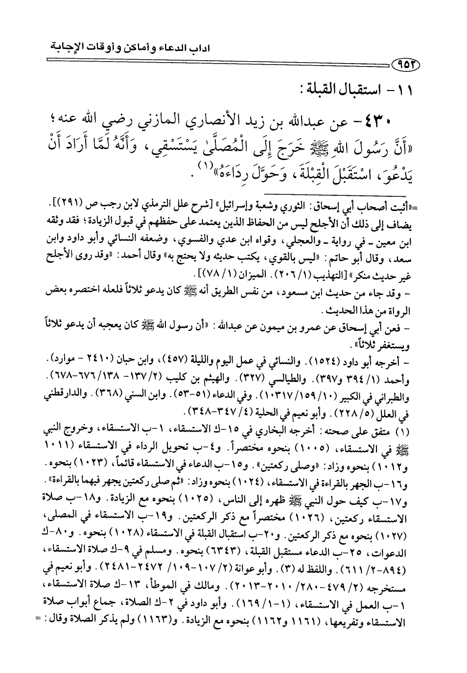 ٤٣٠ - عن عبد الله بن زيد الأنصاري المازني رضي الله عنه؛» أَنَّ رَسُولَ اللهِ صلى الله عليه وسلم خَرَجَ إِلَى الْمُصَلَّى يَسْتَسْقِي، وَأَنَّهُ لَمَّا أَرَادَ أَنْ يَدْعُوَ، اسْتَقَبْل الْقِبْلَةَ، وَحَوَّلَ رِدَاءَهُ» (¬١).