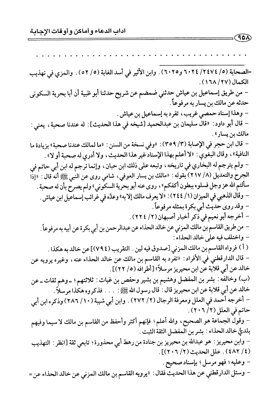- وقول الجماعة هو الصحيح، والله أعلم؛ فإنهم أكثر وأحفظ من القاسم بن مالك لا سيما وفيهم بلدي خالد الحذاء: بشر بن المفضل الثقة الثبت.