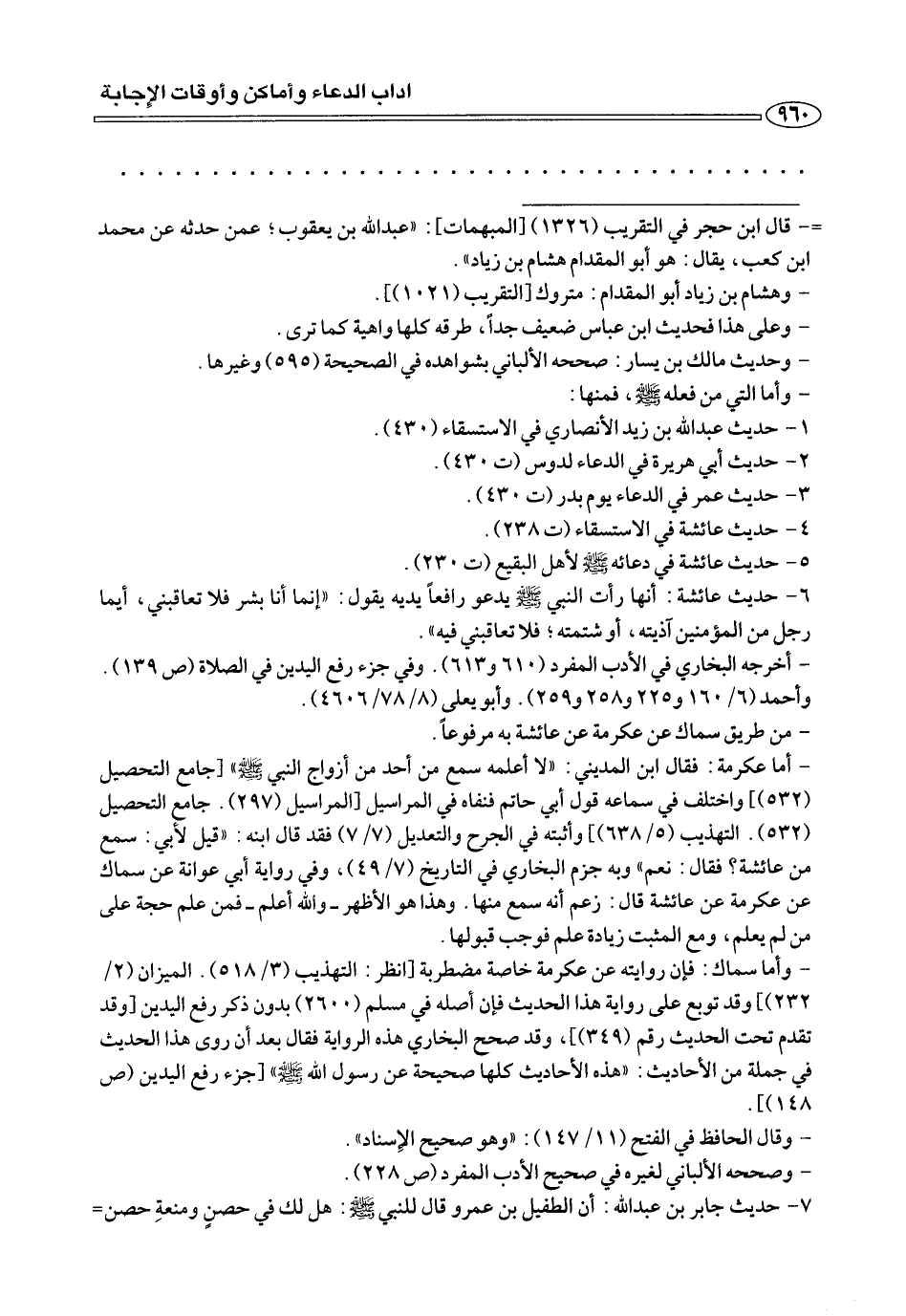- وأما سماك: فأن روايته عن عكرمة خاصة مضطربة [انظر: التهذيب (٣/ ٥١٨). الميزان (٢/ ٢٣٢)] وقد توبع على رواية هذا الحديث فأن أصله في مسلم (٢٦٠٠) بدون ذكر رفع اليدين [وقد تقدم تحت الحديث رقم (٣٤٩)]، وقد صحح البخاري هذه الرواية فقال بعد أن روى هذا الحديث في جملة من الأحاديث: «هذه الأحاديث كلها صحيحة عن رسول الله صلى الله عليه وسلم» [جزء رفع اليدين (ص ١٤٨)].