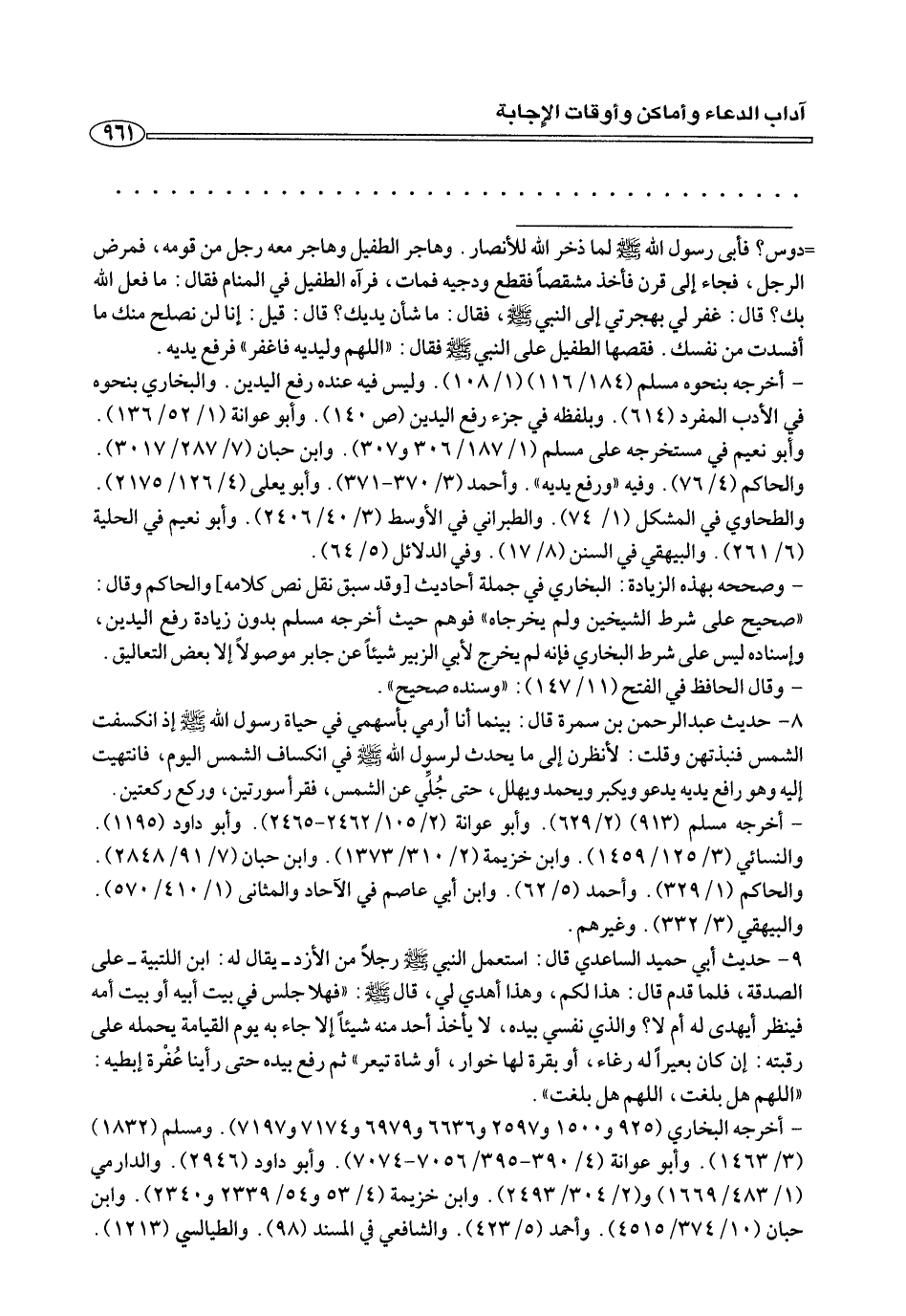 =دوس؟ فأبي رسول الله صلى الله عليه وسلم لما ذخر الله للأنصار. وهاجر الطفيل وهاجر معه رجل من قومه، فمرض الرجل، فجاء إلى قرن فأخذ مشقصا فقطع ودجيه فمات، فرآه الطفيل في المنام فقال: ما فعل الله بك؟ قال: غفر لي بهجرتي إلى النبي صلى الله عليه وسلم، فقال: ما شأن يديك؟ قال: قيل: إنا لن نصلح منك ما أفسدت من نفسك. فقصها الطفيل على النبي صلى الله عليه وسلم فقال: «اللهم وليديه فاغفر» فرفع يديه.