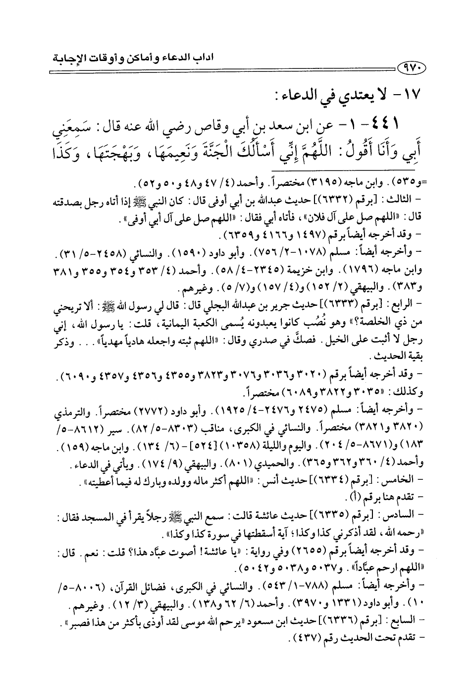 ٤٤١ - ١ - عن ابن سعد بن أَبِي وقاص رضي الله عنه قَالَ: سَمِعَنِي أَبِي وَأَنَا أَقُولُ: اللَّهُمَّ إِنِّي أَسْأَلُكَ الْجَنَّةِ وَنَعِيمَهَا، وَبَهْجَتَهَا، وَكَذَا